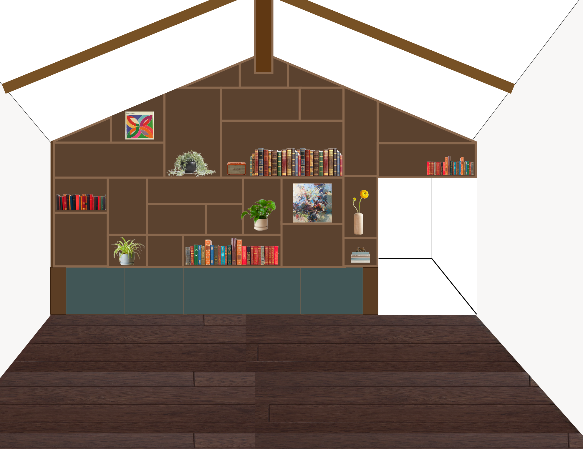 lighter walnut wood shelves and back panel with low painted teal cabinets