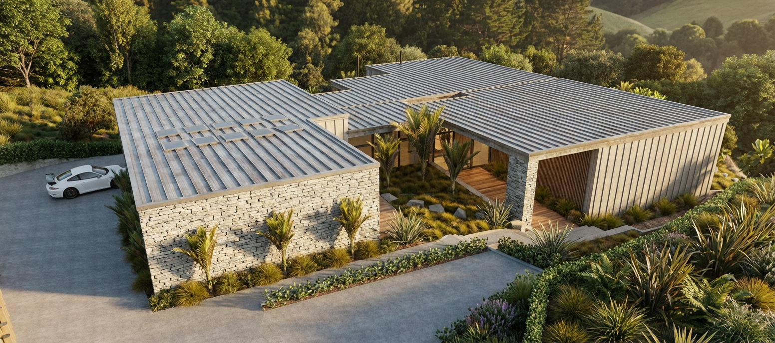 no fencing vegetation native to new zealand light stone schist feature wall on left maintain materials maintain colours light roofing cliffside to ocean