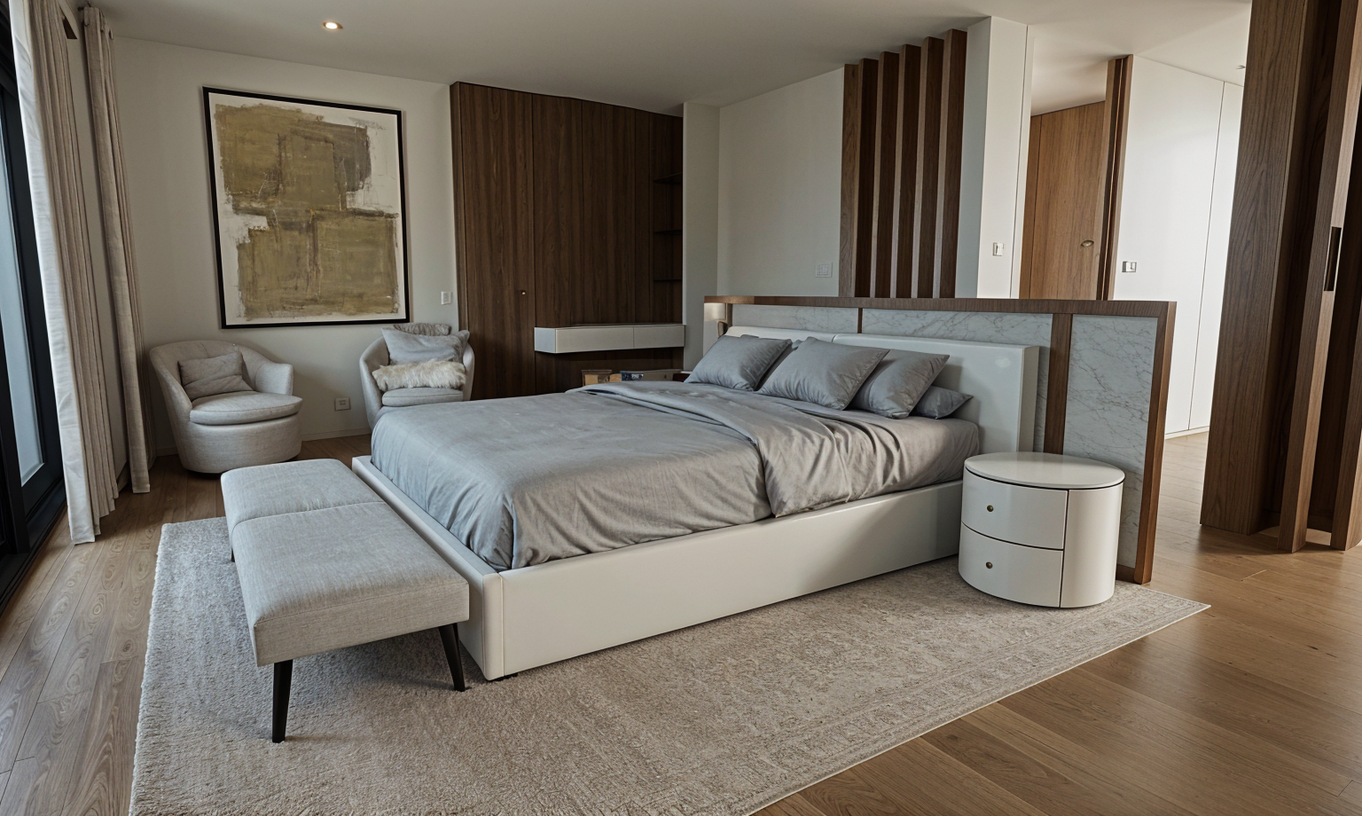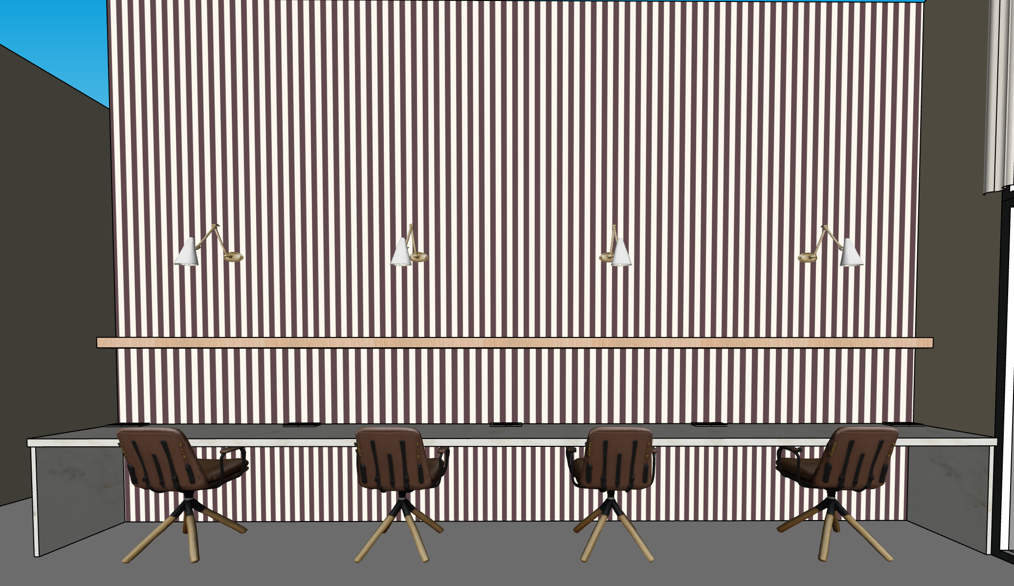 a contemporary workspace with a stylish striped wall in cream and maroon the atmosphere is warm and modern the desk is a sleek gray complemented by elegant brown leather chairs with wooden legs above the desk minimalist white and gold lamps provide soft illumination side walls are muted charcoal gray the overall ambiance is sophisticated and inviting ideal for creativity and productivity