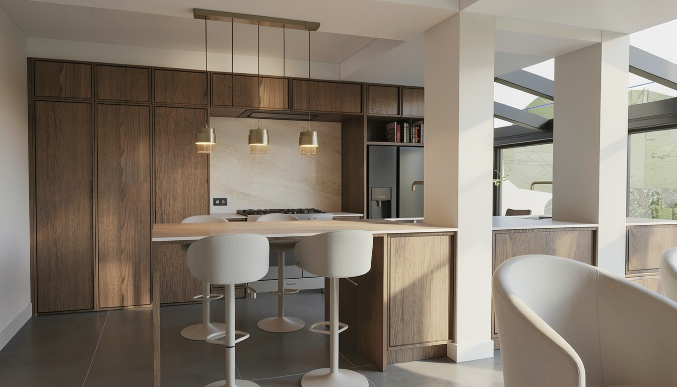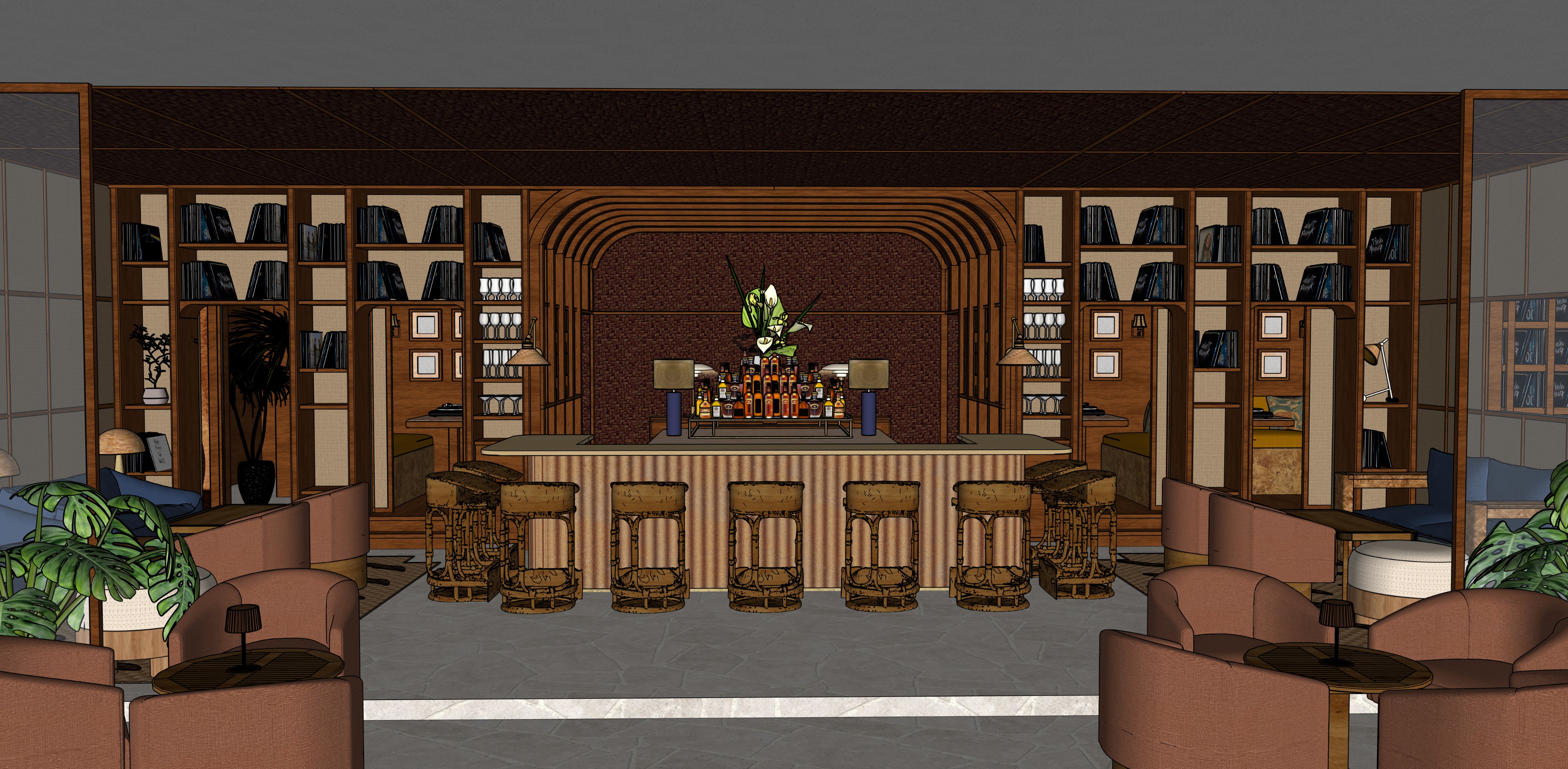 a modern interior with a large plant in the foreground featuring deep green leaves that contrast with a textured woven wall in soft brown the floor is a light warm gray matt tumbled stone the bookcase is a warm wood with the shelves having a very soft amber glow lighting up the glasssware and framing the bar the rum bottles have the same warm glow that invite you into the space behind the bookcase are secret speakeasy booths that have a warm glow behind inviting you in everything feels cosy and atmospheric all table lamps are turned on with low lit warm light this is an evening cocktail listening bar the atmosphere is calm and sophisticated with a harmonious blend of natural and modern elements illuminated by gentle ambient lighting