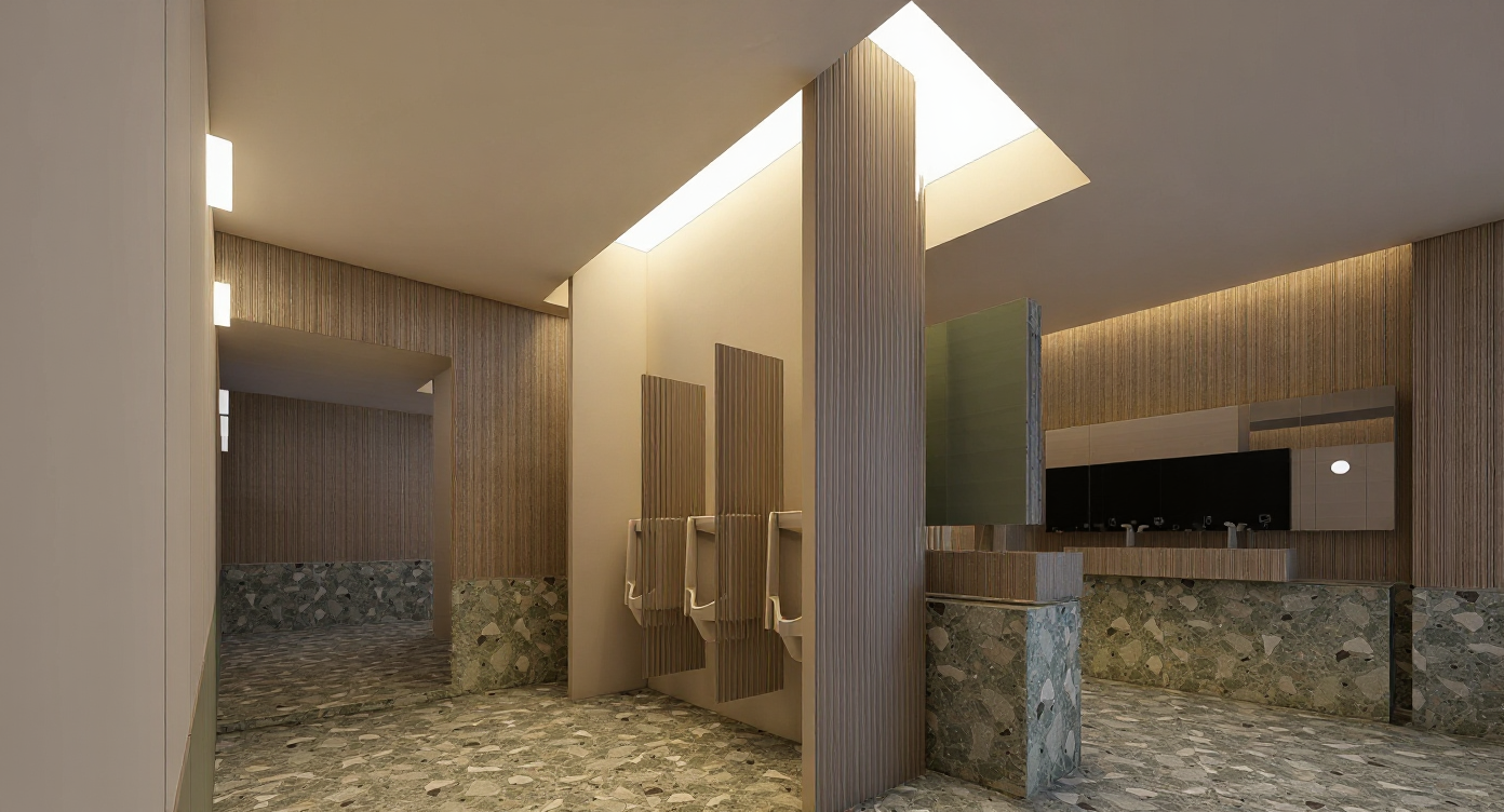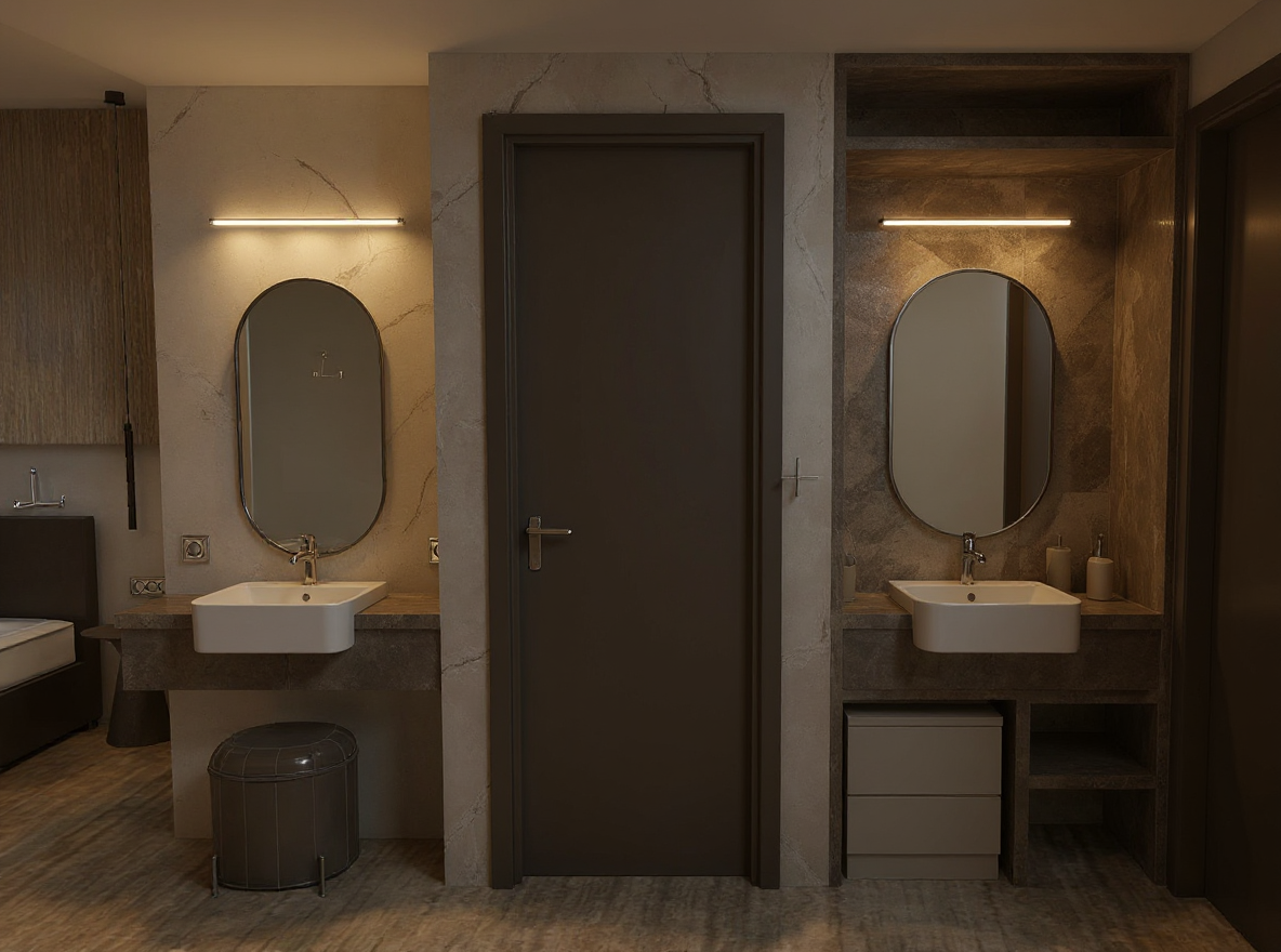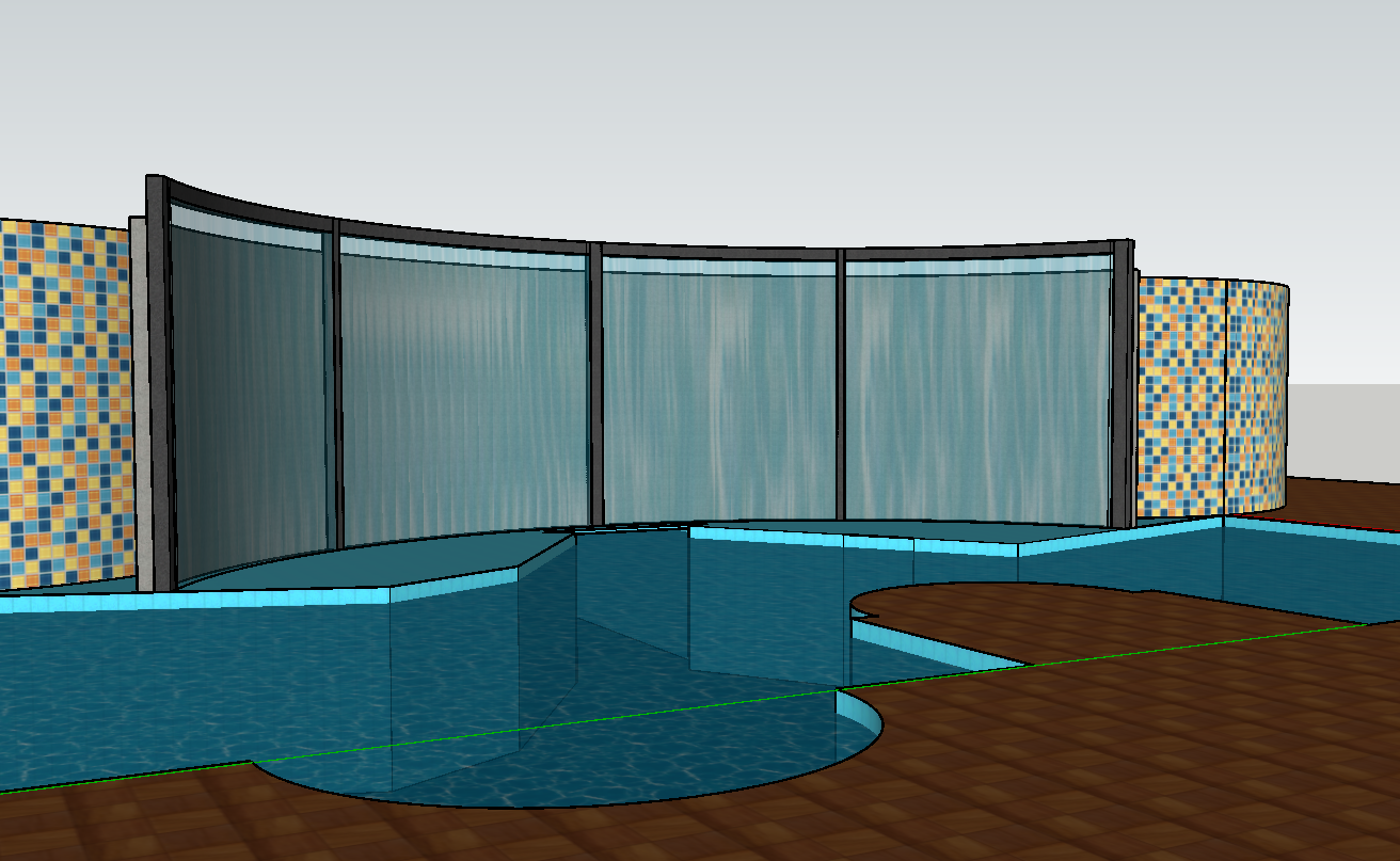 the brown ceramic poolside area a blue ceramic adult pool at the same height filled with water with oval colored ceramic walls on the right and left sides and a gray shiny stone looking arc shaped wall in the middle over which a curtain of water flows and flows into the pool below
