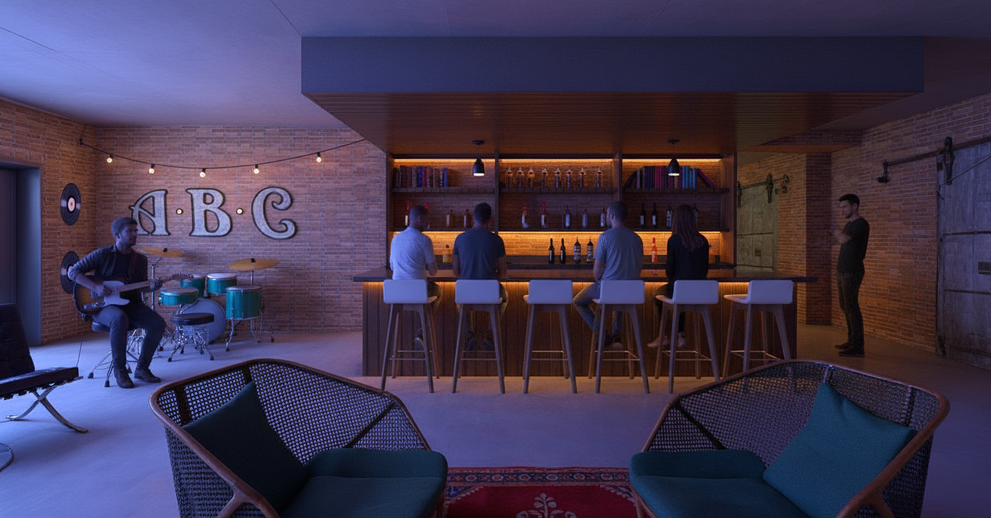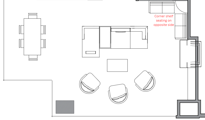 convert this floor plan into a realistic isometric 3d view of a full house show the space from an elevated angle with furniture walls and details visible l shaped sofa facing three chairs centered on fireplace on right side use the same furniture as shows on the plan do not change the orientation of the floorplan