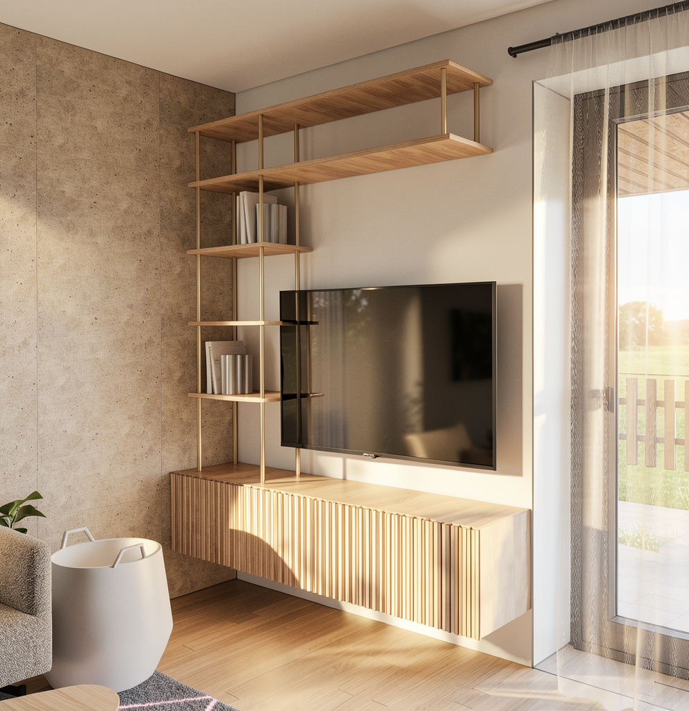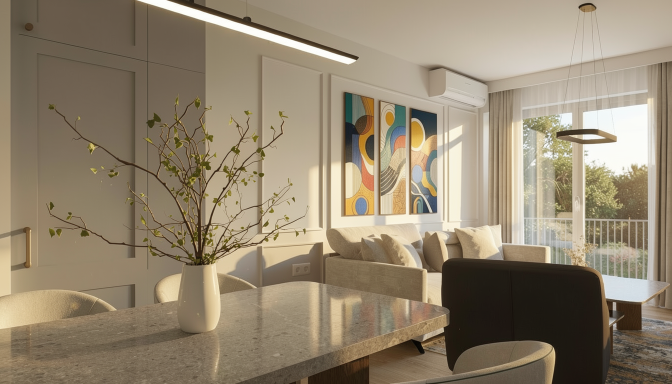 photorealistic render from image photorealistic architectural visualization perfectly frontal street level view of a contemporary european residential building the central building has a clean white facade with a grid of square recessed windows and small minimalist black rail balconies the ground floor is made of reddish brick with narrow vertical windows and a main entrance door on the left side an adjacent beige residential building with traditional balconies and metal railings warm toned facade and roof dormers on the right side another beige modern residential building with glass balcony railings and large windows street scene in front of the buildings with two parked cars a grey sedan and a light yellow car in the foreground on the sidewalk a woman standing with a rolling suitcase wearing a blue shirt and brown pants looking toward the building another adult crouching and talking to a small child standing in front of them bright sunny day blue sky with soft clouds warm natural sunlight realistic shadows ultra realistic architectural rendering high detail materials realistic glass reflections modern european urban street 35mm architectural photography perfectly centered front elevation view symmetrical framing