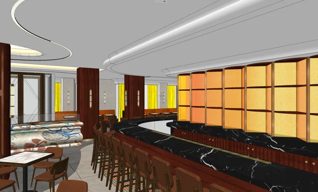transform the provided restaurant interior image into a high end photorealistic render with warm golden hour atmosphere soft glowing highlights and relaxed upscale coastal energy while keeping everything exactly the same same proportions same bar shape same booth seating same ceiling curves same wall finishes same yellow curtains same materials and same spatial configuration do not move or alter any objects geometry textures colors or furniture positions the chairs throughout the restaurant must remain exactly in the same locations and proportions but their materials should read realistically the bar stools should appear upholstered in soft reddish brown leather with subtle natural sheen and cushioned tactile texture the dining chairs at the tables should appear in the same reddish brown tone but upholstered in soft velour with a matte plush surface and gentle directional nap while keeping their shapes frames and positions unchanged add premium table settings including wine glasses champagne flutes tropical style cocktails elegant plates cutlery cloth napkins and a seafood tasting arrangement with oysters while keeping all tables and chairs in their exact positions include modern young guests seated at the bar and at selected tables casually social correctly scaled tastefully integrated without crowding or obstructing architectural details add two bartenders behind the bar preparing drinks and interacting naturally while preserving the bar s structure and alignment the mosaic seafood display counter must clearly appear filled with ice fish lobsters shrimp and shellfish with cool reflections moisture and texture while keeping its exact position and shape unchanged on the bar shelves add wine bottles and premium alcohol bottles arranged tastefully and evenly while keeping the shelving structure unchanged the shelving should feature warm and bright accent lighting enhancing reflections and bottle silhouettes the wall behind the bar shelves must clearly appear as amber glass in a deeper richer golden amber tone with a ribbed textured surface and illuminated from behind with warm vivid backlighting while maintaining its exact geometry proportions framing and alignment lighting should emphasize golden hour warmth gentle reflections soft shadows enhanced color richness and luxurious catalog level realism improve depth and realism through wood grain richness marble shine brass highlights fabric texture and polished clarity while keeping the entire scene exactly as originally designed