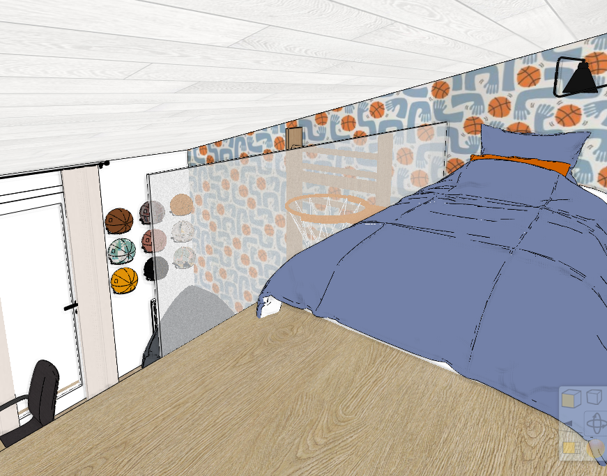 loft has a safety glass on the side ceiling has white painted wood flooring is light wood colours backwall has vintage basketballs in different colours bed cushion is dark orange remove logo from bottom right corner behind glass door there s a view of a far forest from 3rd floor nad black railing