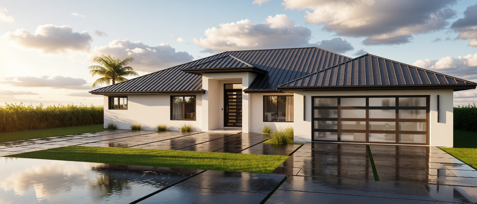 a beautiful modern two story house with a white exterior and white trim the roof is a red metal and the windows are adorned with black frames and black shutters the entrance features a warm oak door the scene is set during a tranquil late afternoon with soft shadows and a clear blue sky the atmosphere is peaceful and inviting capturing the essence of suburban charm with a touch of elegance