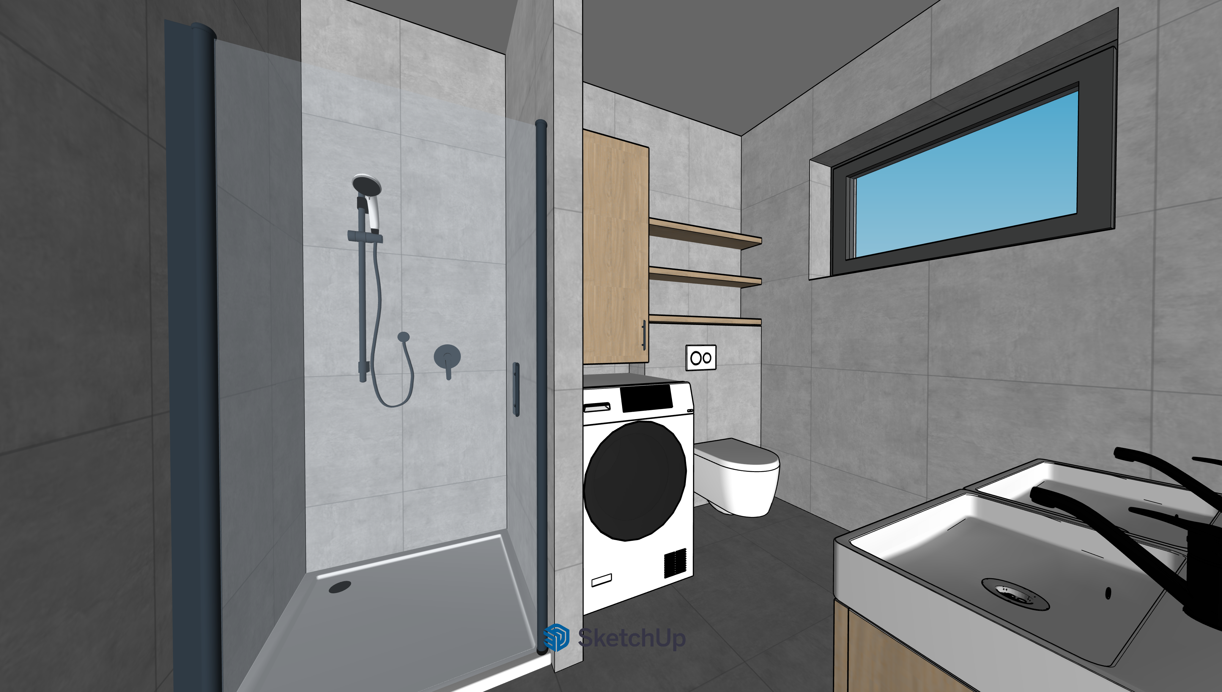 interior shot tuln modern koupelna s minimalistick m designem st ny jsou oblo eny obklady 60 60 cm v designu cementi sv tle b ov strop je b l podlaha m dla bu 60 60 cm v tomt designu d ev n prvky p rodn textura d eva v dekoru sv tl ho dubu sprchov kout m b lou vani ku sklen n dve e s ern mi kovov mi prvky a ernou sprchovou sadu s p kovou bateri vpravo je dvojit umyvadlo se 2 bateriemi s d ev nou sk kou pod umyvadlem nad umavydlem je zrcadlo mezi pra kou a st nou s oknem je prostor irok 1 2 m pro toaletu geberit s ovl d n m splachova e geberit toto je nutn respektovat zv razni sp ry v dla b a obkladech p idej horizont ln aluzie v okn