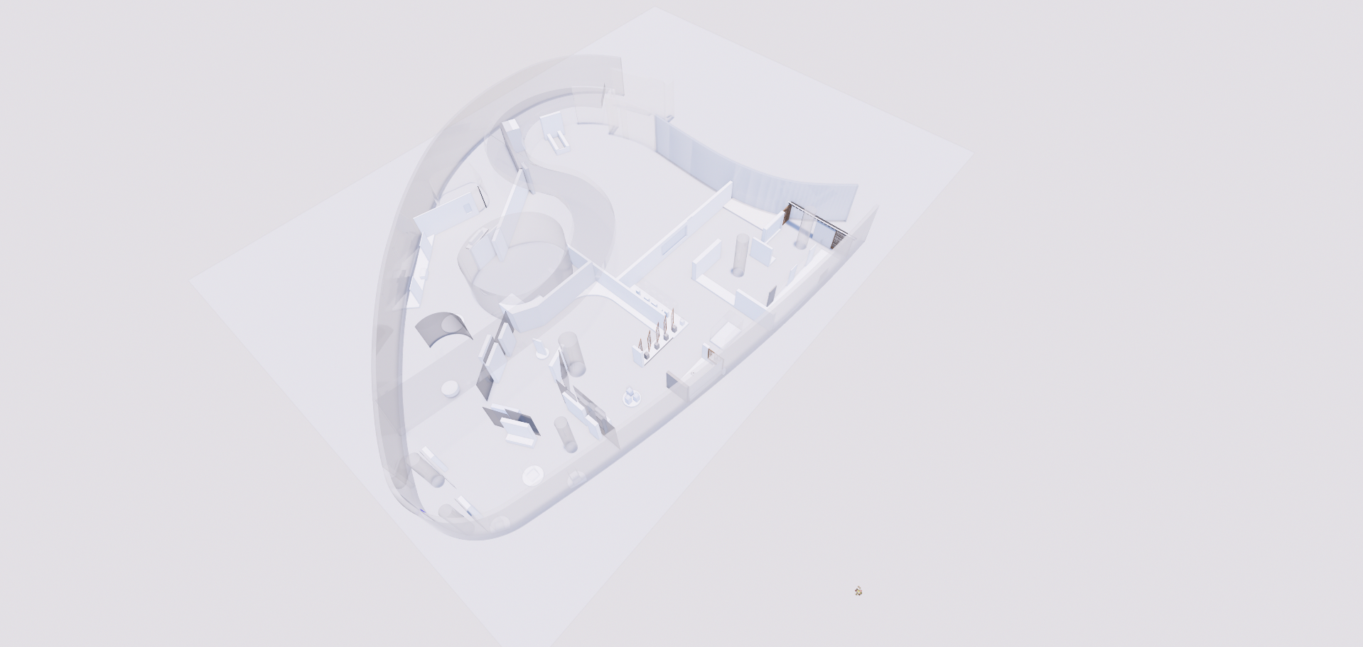 a beautifully rendered architectural model with flowing curves and minimalist design using soft white tones for the walls and floors add gentle shadows for depth and incorporate natural soft lighting to create a serene and modern atmosphere