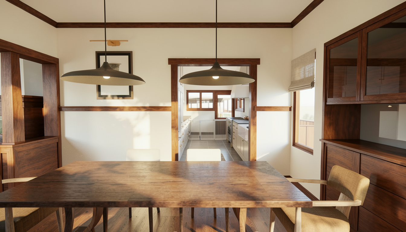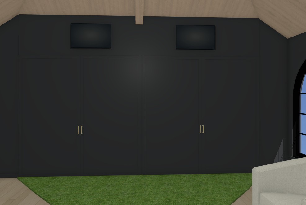 view of black cabinetry in a club room the floor of the club room is herringbone white oak with fake turf immediately in front of the cabinetry near the ceiling is a painted black soffit with two tv screens the vaulted ceiling is paneled white oak with a large beam centered over the simulator to the right is a large arched window with painted black trim and a view of the backyard through the window a boucle club chair is in the immediate foreground the rendering is 8k with a hyperrealistic finish