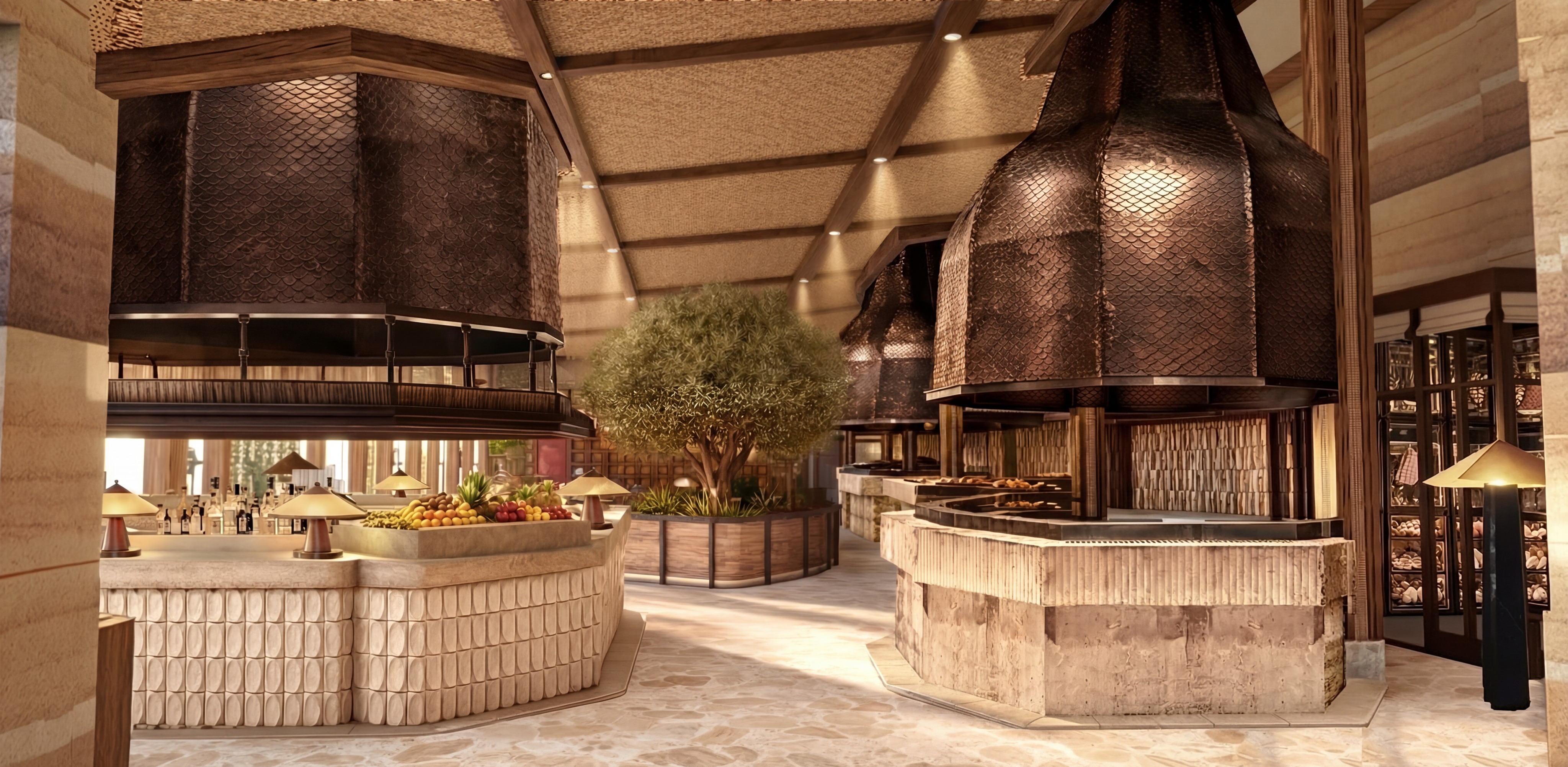 integrate the ceiling better so that it is not disjointed and make it high res make the tree in the middle sharper keep everything else as it is make it photorealistic