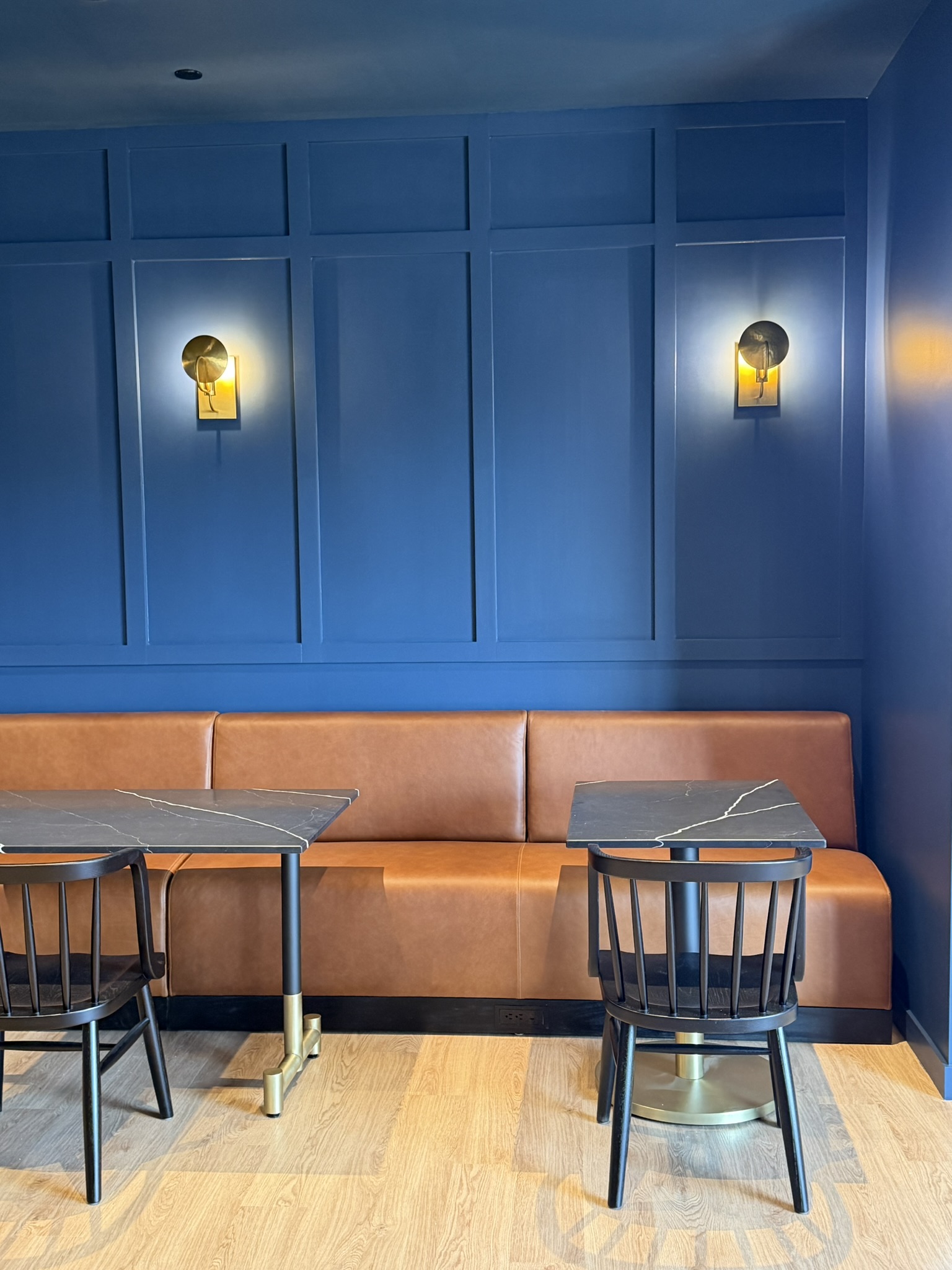 darken the blue color slightly add pillows to the banquette in neutral colors with stripe and plaid style patterns