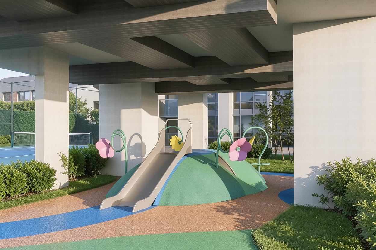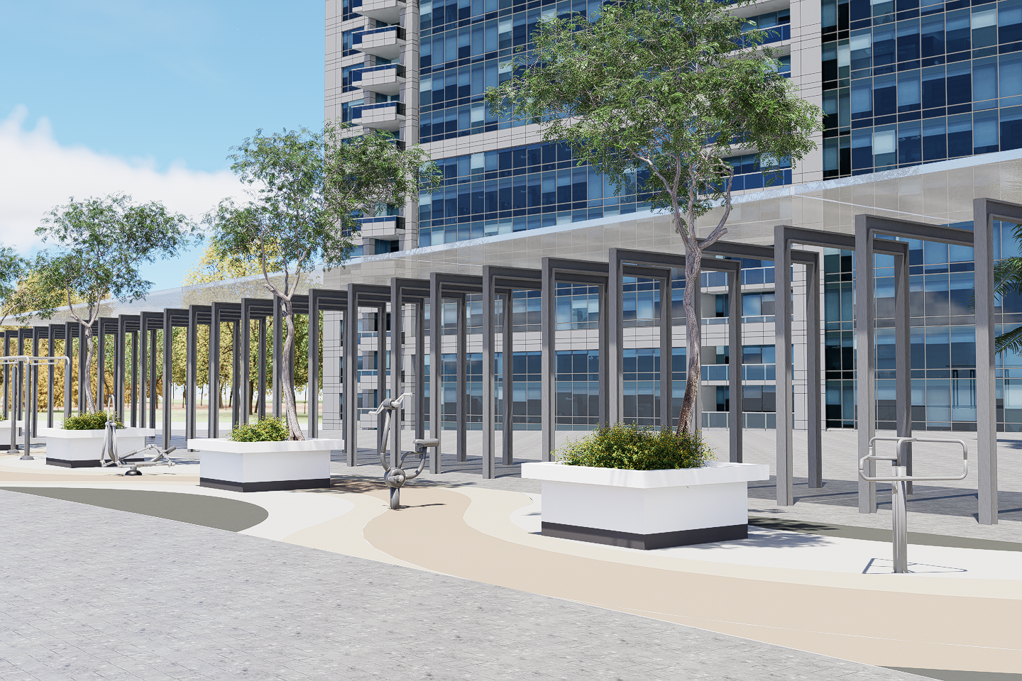 dont change the flooring colour dont change the fitness this is outdoor fitness at the left side is glass corridor add some shrubs