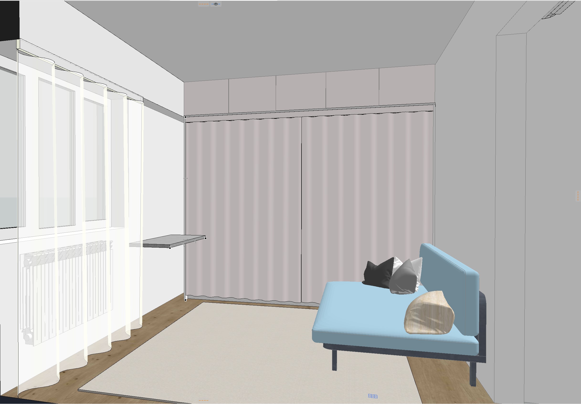 curtain backdrop scene in a modern room featuring a soft muted gray curtain with subtle texture illuminated by gentle natural light creating soft shadows the walls are painted a light gray adding a neutral tone the flooring is richly textured wood with warm brown tones enhancing the cozy atmosphere above the curtain a series of minimalist light gray cabinets add an element of modern design the ambiance is calm and serene perfect for a peaceful and elegant room setting