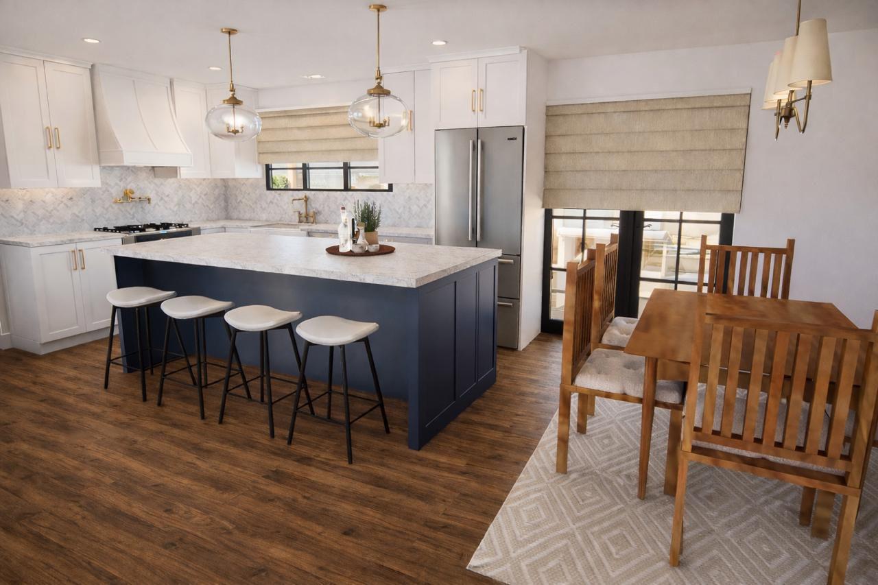 change the cabinet colors to light oak and the island cabinet color sage green keep counter top the same color some change the structure or form