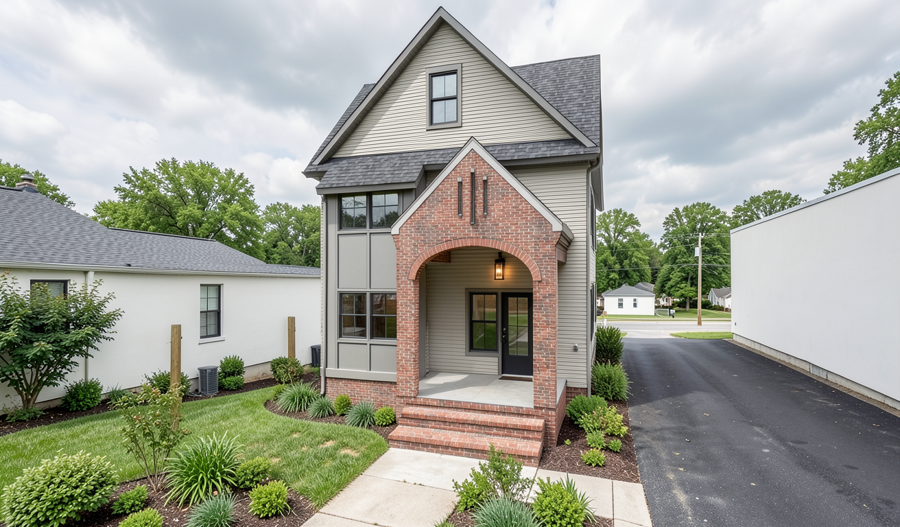 make this more realistic enhance the materials daylight and airy atmosphere with clouds the lights are dimly visible through the windows the environment is central texas with trees and a residential fence black siding adn white brick