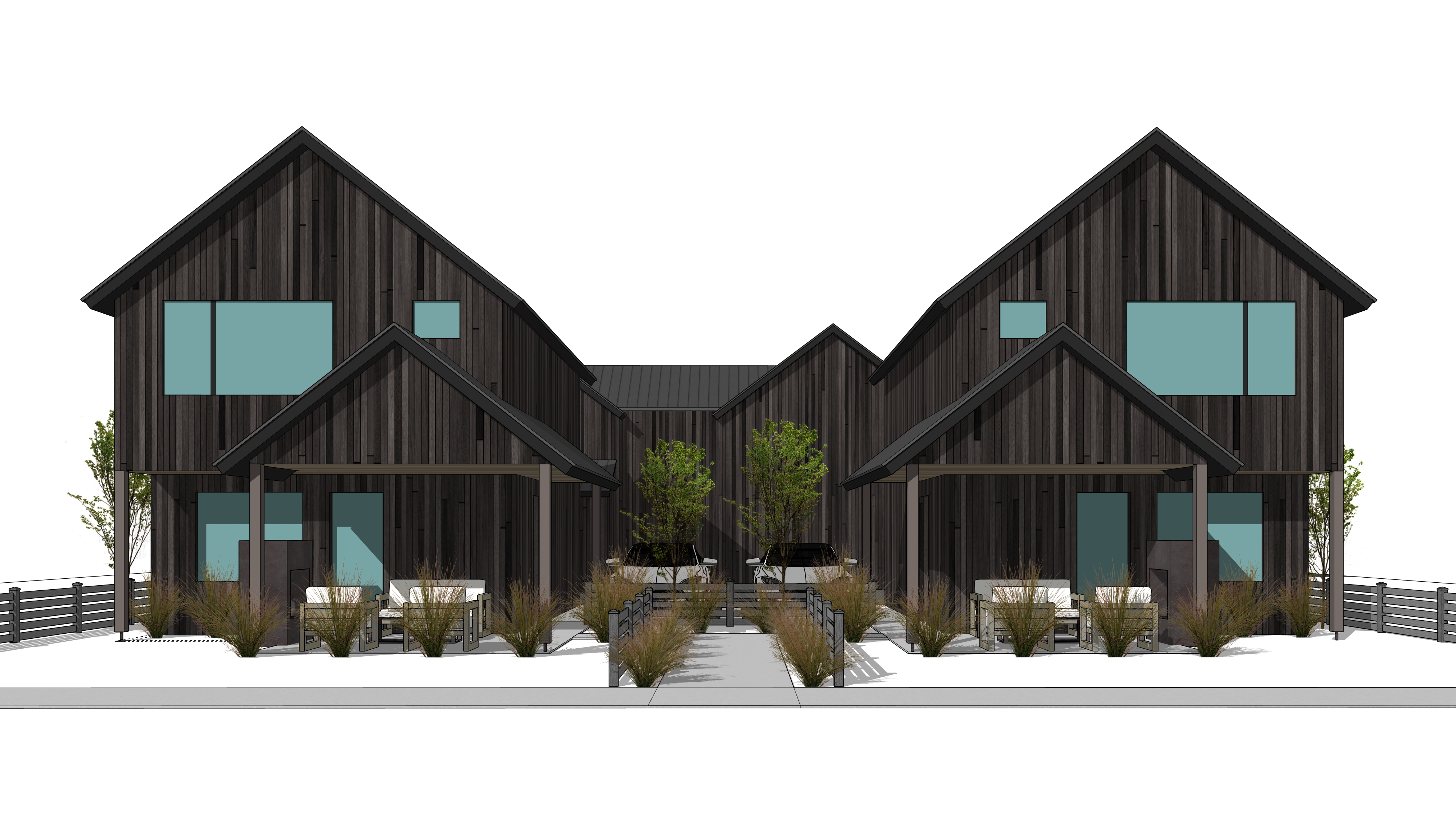 a modern architectural rendering featuring three dark wooden houses with large teal tinted windows set against a clear sky the wood exteriors in rich charcoal are complemented by sleek black metal roofs surrounding the houses are small green shrubs and wild grasses in earthy tones set in a residential neighborhood a minimalist gray wooden fence encircles the property the setting exudes a serene and contemporary atmosphere emphasizing clean lines and natural materials the lighting is soft and natural casting gentle shadows to enhance the overall aesthetic