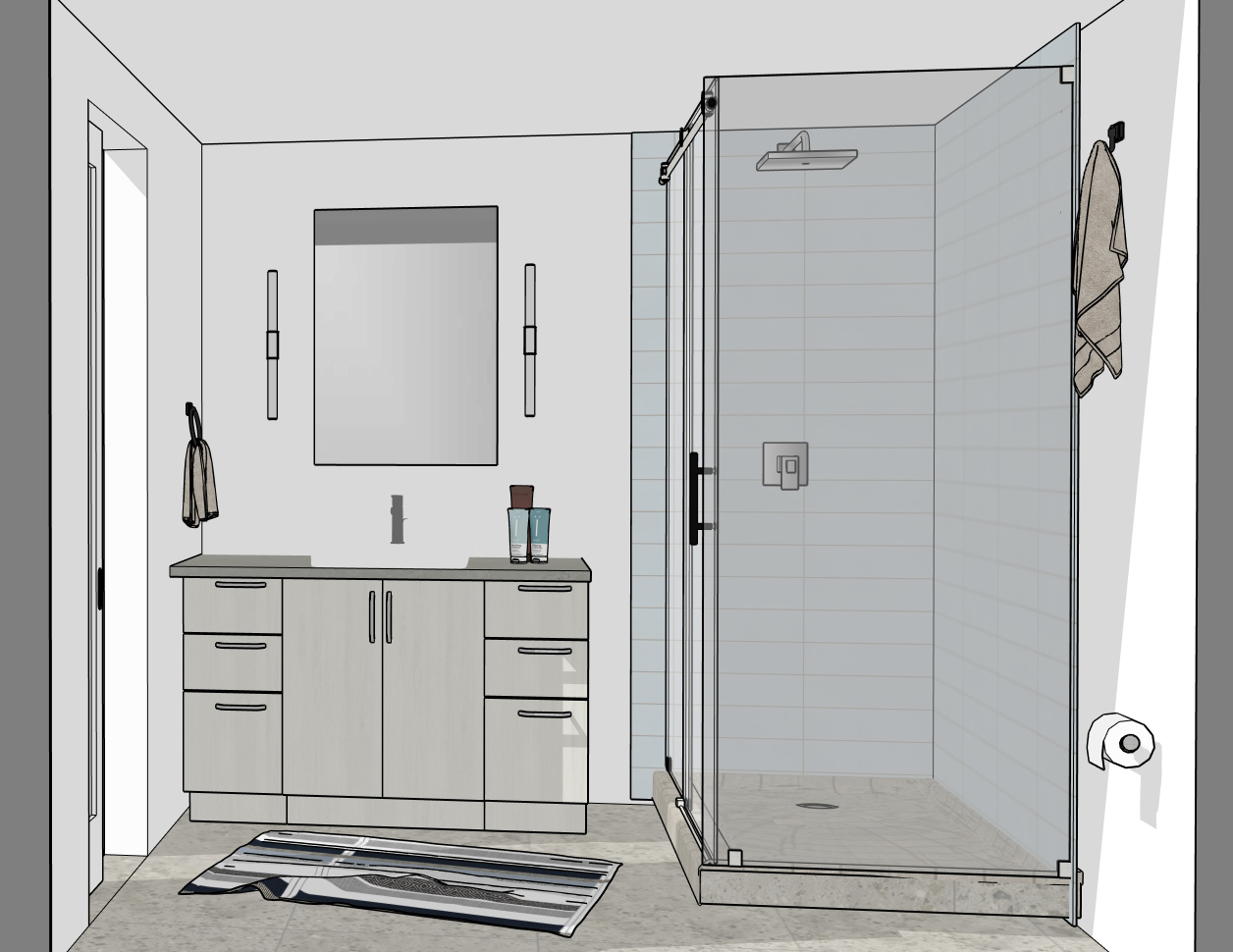 keep geometry create a photorealistic image of a modern bathroom with a serene and minimalist atmosphere use a soft gray and white color scheme for the walls and floor tiles to convey cleanliness and tranquility the vanity should have a light wooden tone complementing the countertop with sleek silver handles the sink should be white gleaming against the subtle matte surface of the countertop showcase a glass shower enclosure with chrome fixtures conveying a sense of modern elegance a plush rug with gentle gradients of blue gray and white lies on the floor hang a luxurious patterned robe in neutral tones on the wall utilize soft natural lighting to enhance the bathroom s ambiance casting gentle shadows and highlighting the room s sleek features