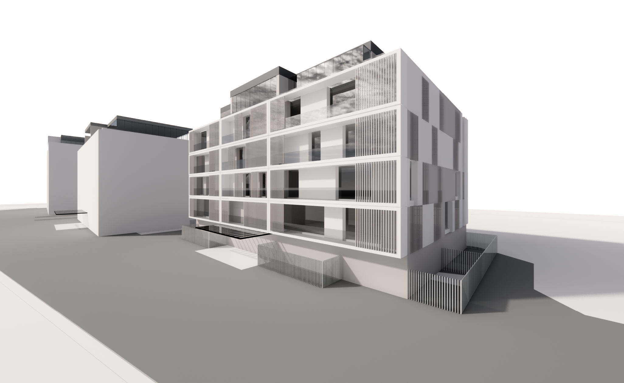 modern residential architecture wooden balconies grey windows reflection in the windows plants on the balconies trees and bushes around the building fancy cars clouds above light coming through loungechairs on the balconies modern benches in front of the building spectacular entrance white fascade repeat impplementation of wood on the two buildings in the back