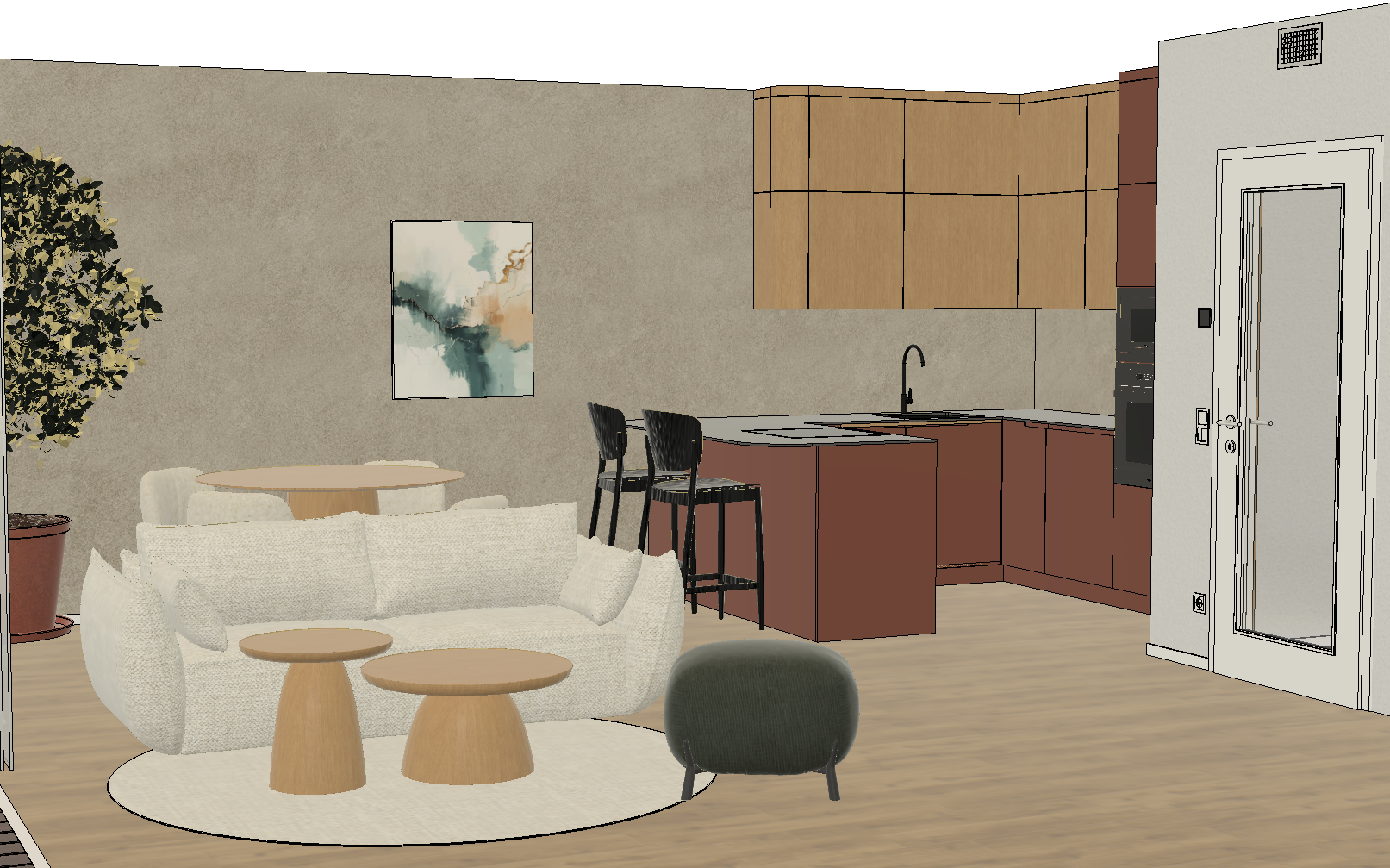 strong controlled prompt use the provided screenshot strictly as the base image for composition camera angle proportions furniture placement and architecture do not change the layout object positions furniture shapes or room geometry only improve materials lighting and realism convert the scene into a highly realistic interior render of a modern open plan living room and kitchen kitchen the lower kitchen cabinets have a warm cinnamon brown color with a matte finish the upper kitchen cabinets are natural oak wood with a soft subtle grain and the same tone as the wooden tables in the room the kitchen countertop is dark grey stone with a very subtle almost uniform texture and minimal veining install a continuous led strip light underneath the upper kitchen cabinets creating soft under cabinet lighting that gently illuminates the countertop instead of a backsplash the wall behind the kitchen counter is finished with a warm toned cement plaster concrete microcement surface with a soft natural texture walls the wall behind the dining table has the same warm cement plaster finish as the wall behind the kitchen countertop the finish should have a warm beige grey cement tone natural variation and a smooth hand applied texture wood elements the following elements are natural oak wood with a consistent tone coffee tables in the living area dining table behind the sofa upper kitchen cabinets shelving niche on the right side of the tall kitchen cabinet the oak should have soft subtle grain with a calm natural appearance furniture bar stools are black wood with a matte finish coffee tables are solid oak wood dining table is oak wood in the same tone as the coffee tables dining chairs around the dining table are upholstered in white boucl fabric with a pronounced textured surface the chair legs have the same cinnamon brown color as the kitchen cabinetry textiles the rug is light grey with a pronounced woven textile structure the sofa is upholstered in fabric slightly darker grey than the rug the round ottoman in the foreground is upholstered in dark green fabric lighting natural daylight enters from the left side of the room producing soft realistic shadows and balanced interior illumination the under cabinet led lighting adds a subtle warm glow across the kitchen countertop style calm modern interior scandinavian inspired design natural materials warm tones soft textures photorealistic rendering quality global illumination high detail materials important constraints do not modify camera position furniture placement object proportions room layout architectural elements only enhance materials textures lighting and realism