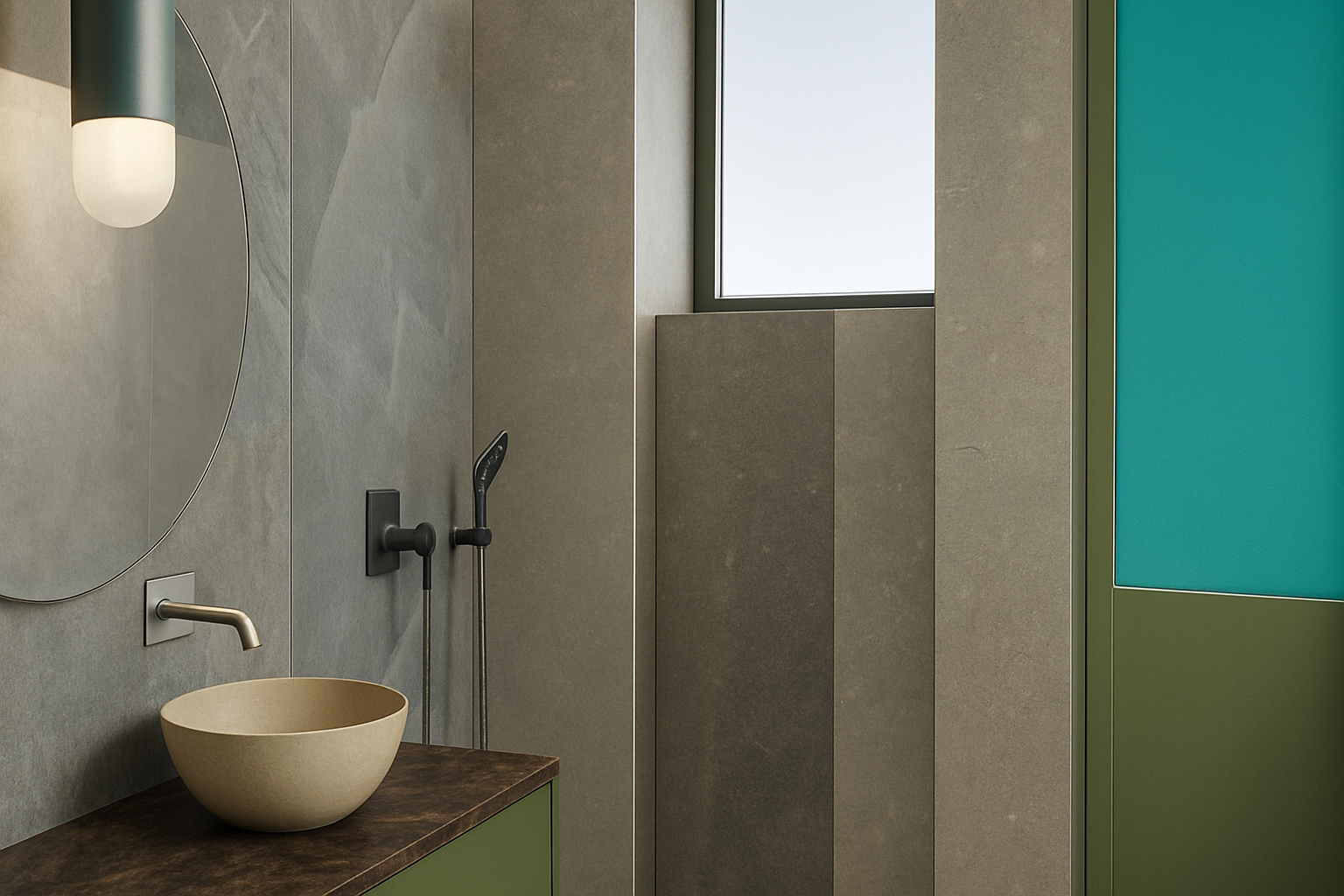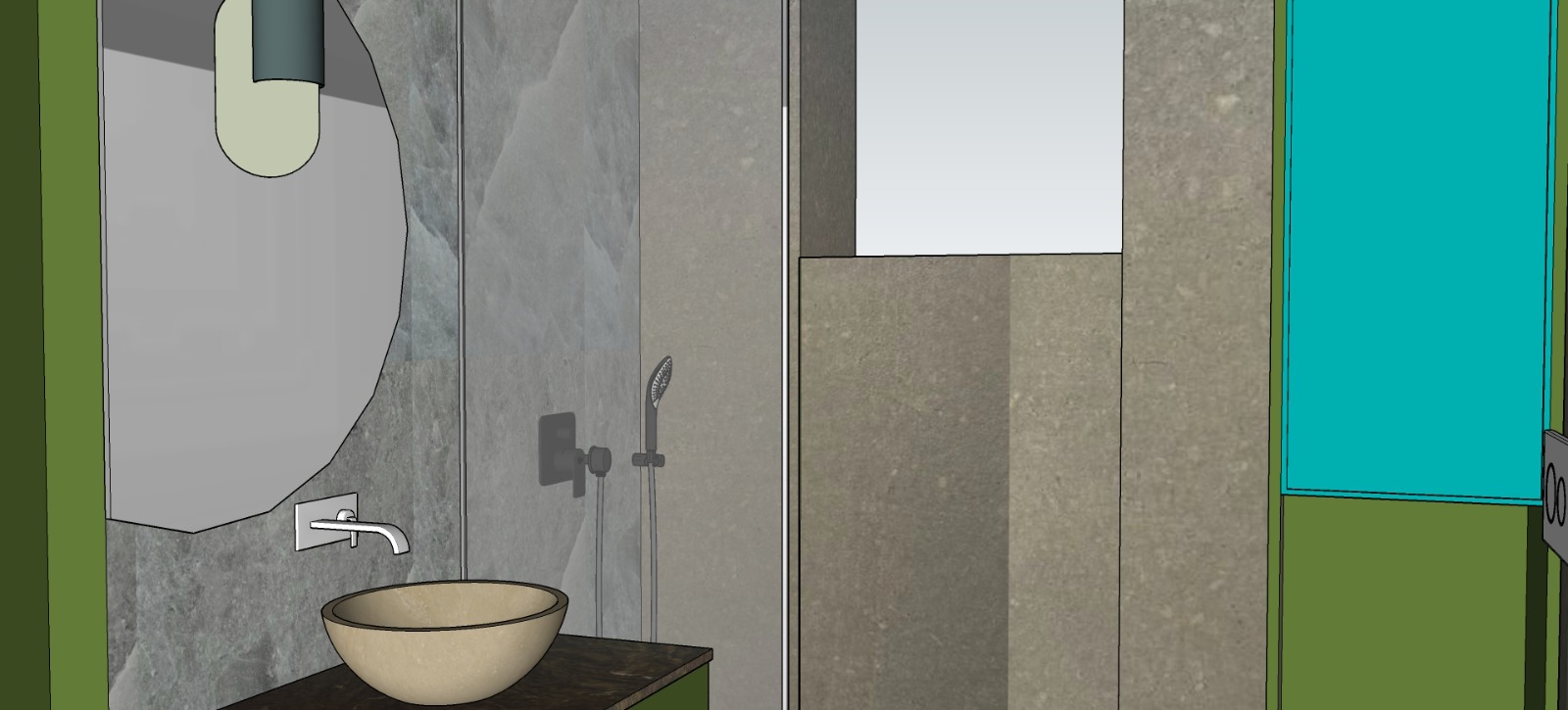 interior shot the sink in white porcelain the counter top in green marble the faucets in stainless steel shiny and the left cabinet dark grey and olive green color