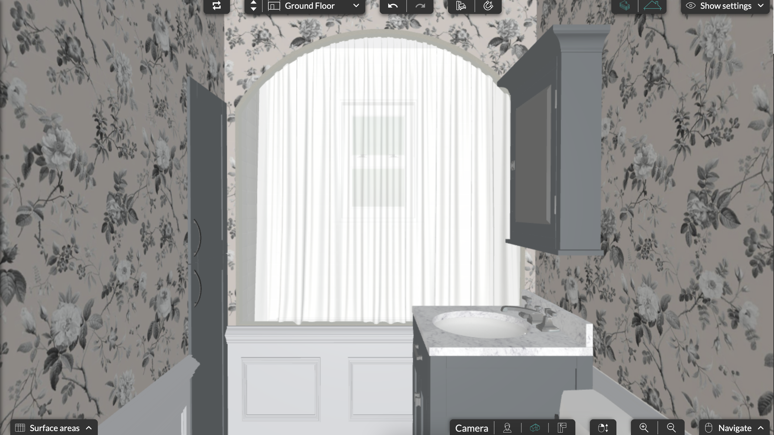 subtle neutral colored floral wallpaper gray blue vanity
