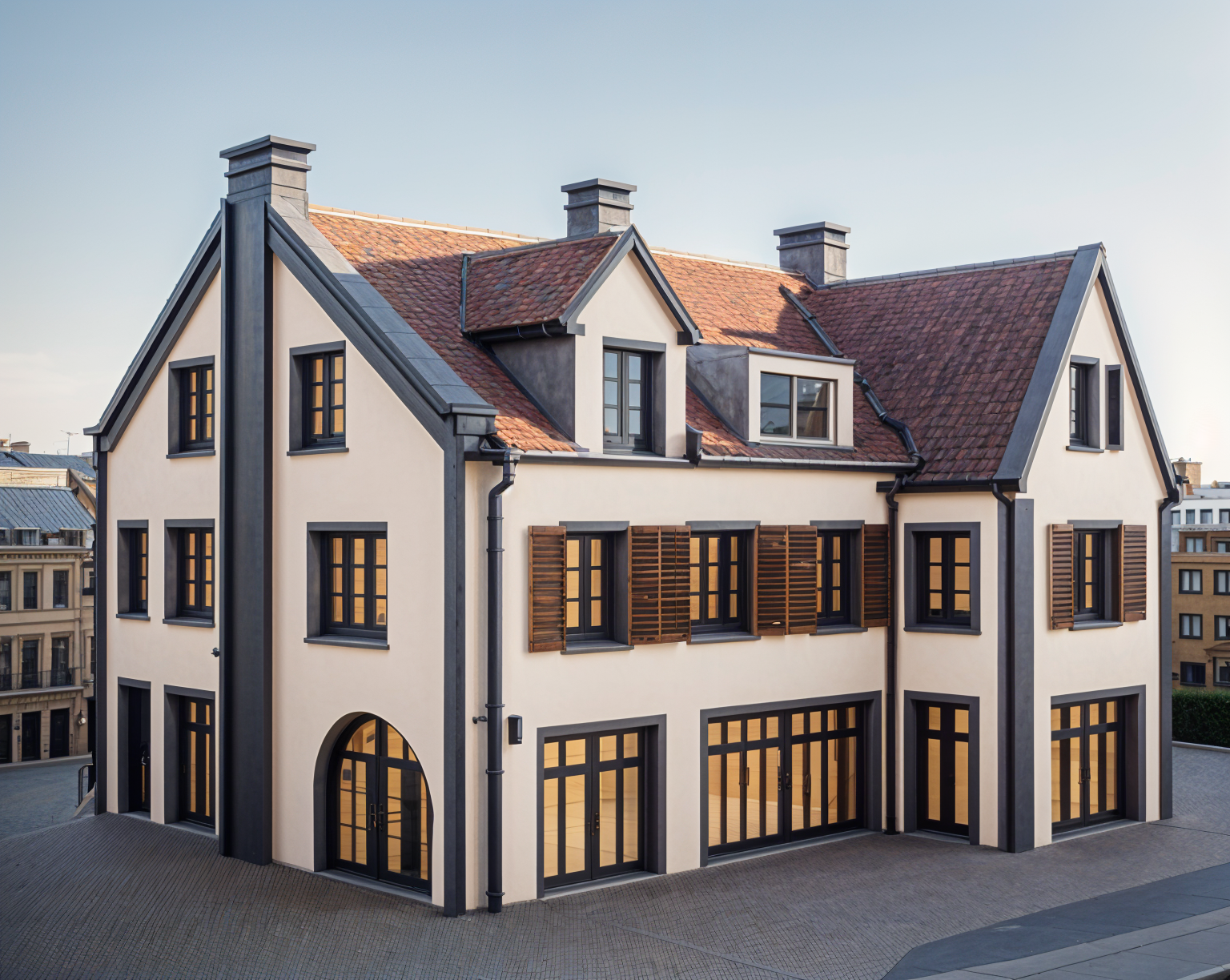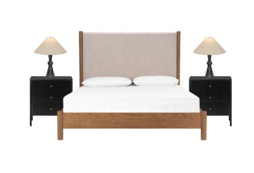 plaintext create a realistic bedroom scene featuring a central bed with a wooden frame in a warm oak finish the headboard should be upholstered in a soft beige fabric providing a cozy and elegant touch on either side of the bed place two black nightstands each featuring three gold accented drawers atop each nightstand position a stylish table lamp with a tapered cream colored shade and a sleek black base use soft warm lighting to create a serene and inviting atmosphere the bed is neatly made with crisp white linens and pillows giving a sense of comfort and tranquility