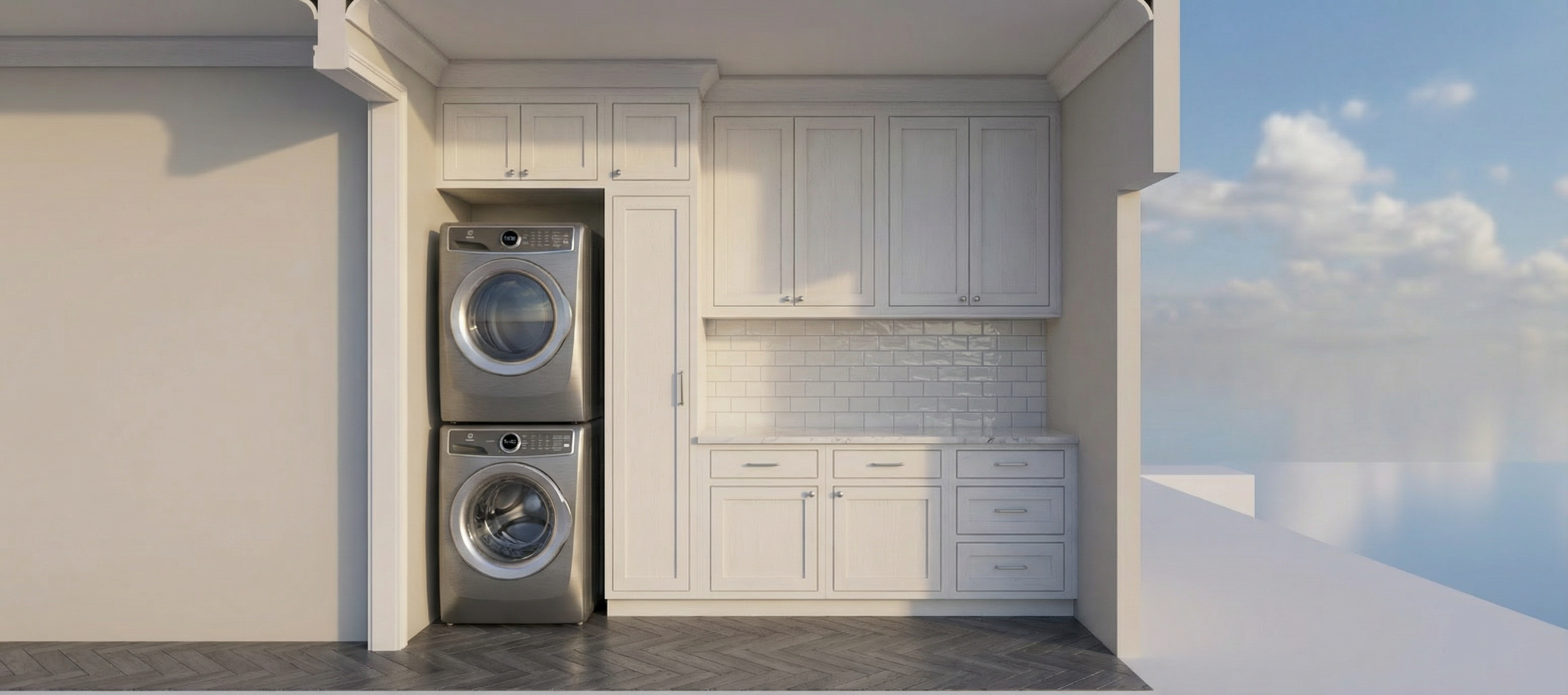 render a modern entrance hallway with a cozy and welcoming atmosphere include a built in wardrobe and storage unit in the corner featuring clean minimalist lines use white for the cabinetry to evoke brightness and openness incorporate light oak wood tones for the doors and interior paneling to add warmth and natural texture design the flooring with a light oak finish that complements the wood elements enhancing the harmonious look apply soft warm lighting to create an inviting ambiance reflecting gently off the white surfaces aim for a contemporary yet comfortable aesthetic