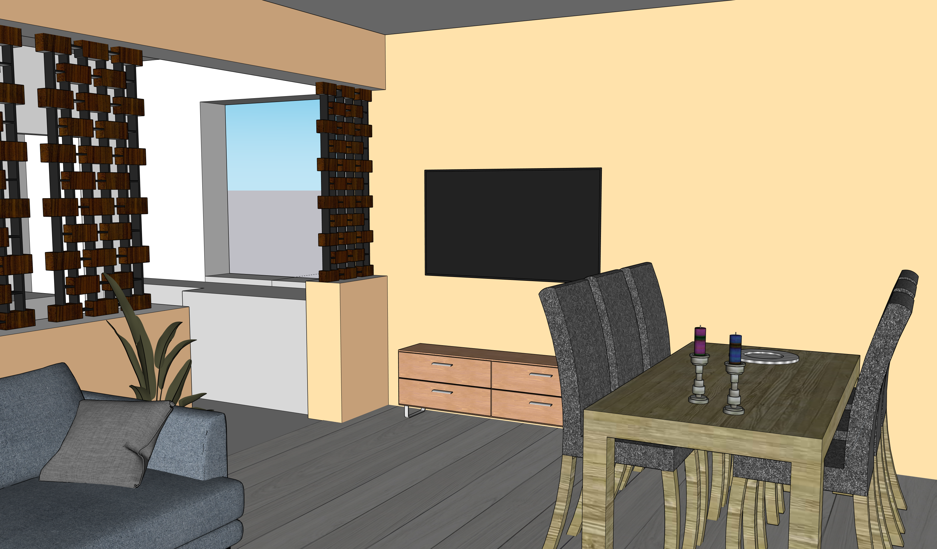 create a beautifully rendered modern living room interior the walls are a warm soft beige use rich dark wood accents for the lattice divider the floor is a smooth elegant dark gray wood the sofa is upholstered in a luxurious deep blue fabric with gray cushions add a sleek modern flat screen tv mounted on the wall the dining table is a polished light oak with high backed chairs in a textured charcoal fabric include decorative candles in dark purple and blue atop the table set a relaxed and cozy atmosphere with natural light streaming through large windows