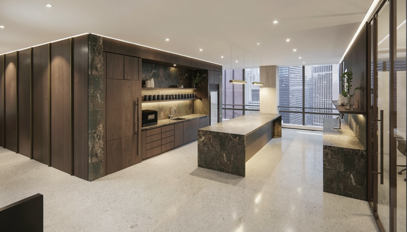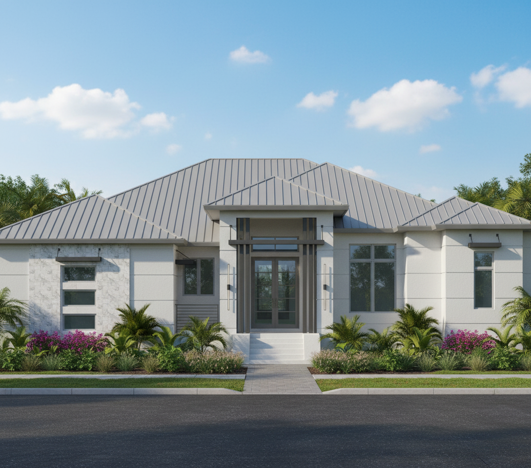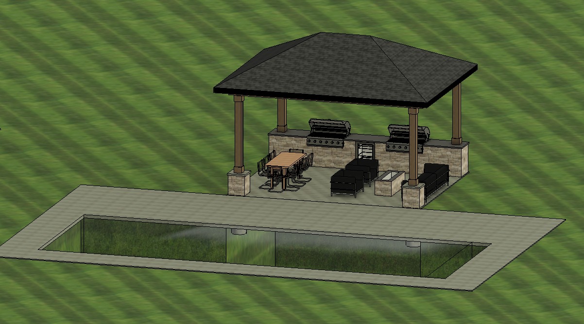create an exterior rendering with inground fiberglass pool and covered structure stone base on columns with outdoor grilling area and fire pit under covered structure add landscaping and blue skies