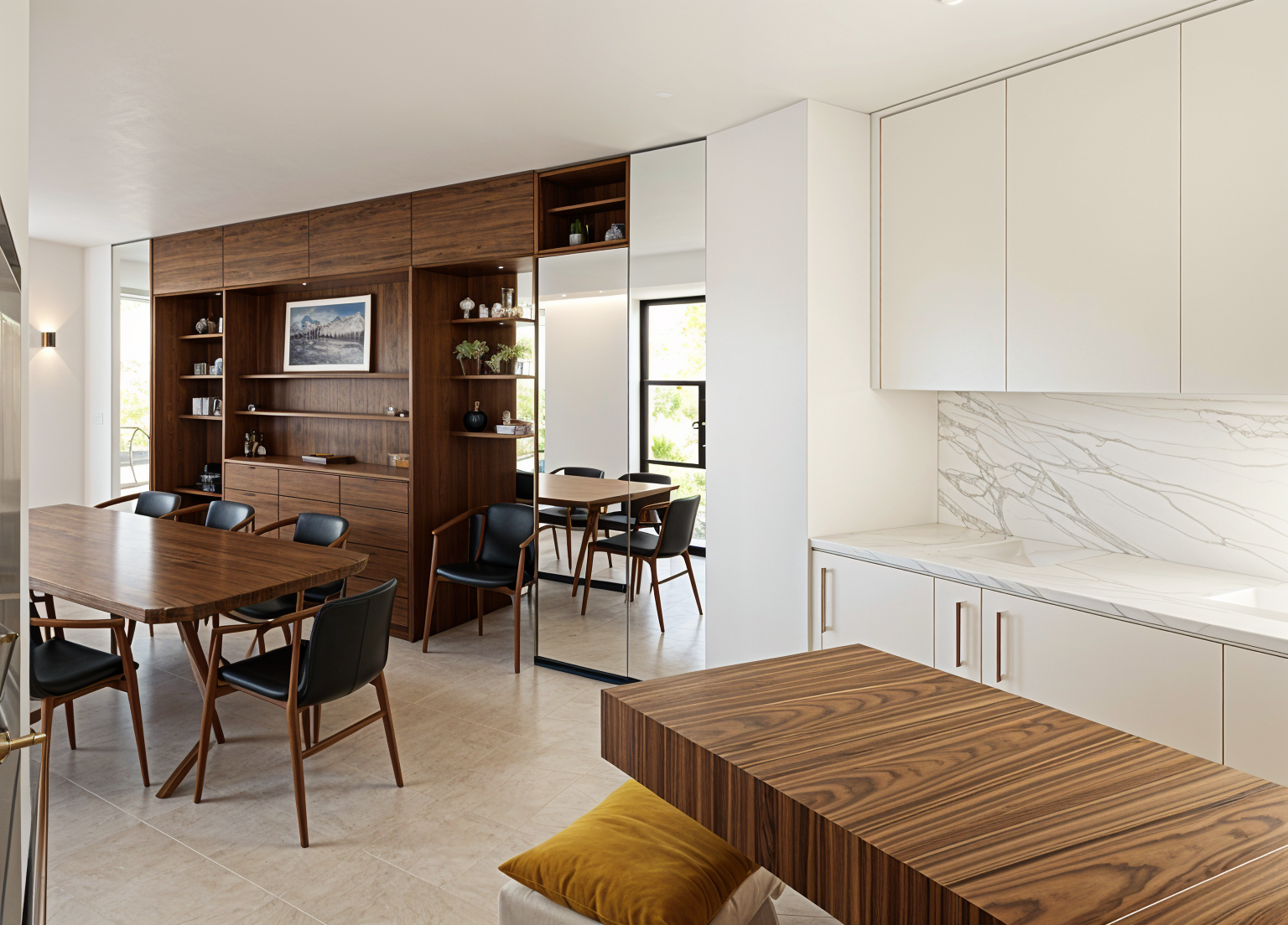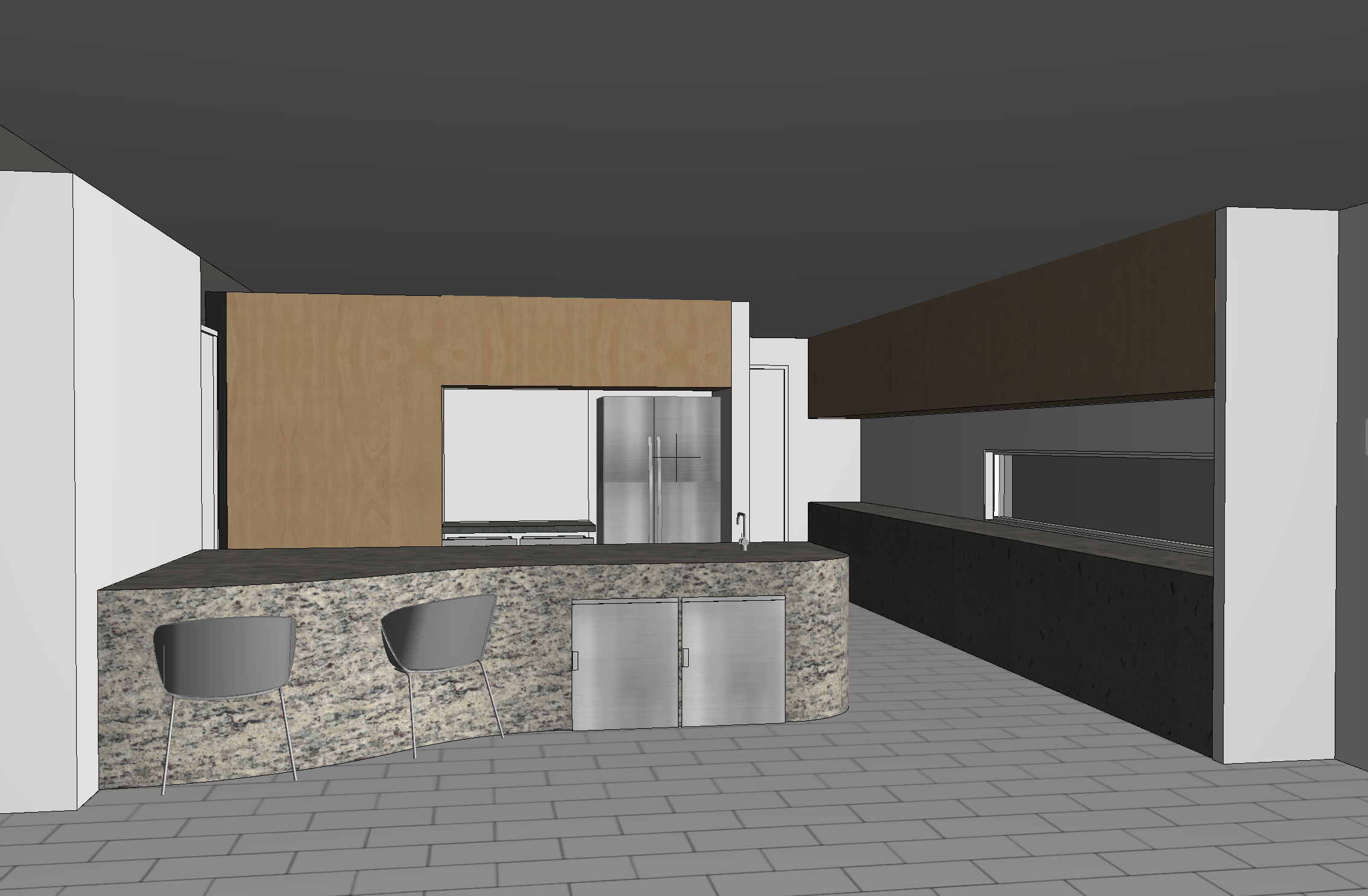 transform this archicad 3d screenshot into a photorealistic interior render of a modern japandi style kitchen maintain the exact geometry layout camera angle and proportions from the original model style japandi japanese scandinavian minimalism calm warm and highly refined materials light natural oak or ash wood cabinetry with subtle grain matte off white or warm beige walls smooth microcement or light stone countertop minimalist matte black or brushed stainless steel fixtures soft neutral textured backsplash stone plaster or handmade tiles light wood or neutral toned flooring design elements flat panel cabinets with integrated handles minimal clutter very clean surfaces open shelving with a few curated ceramic bowls and pottery one or two small indoor plants bonsai or minimal greenery simple pendant lighting with soft warm light subtle linen or paper textures inspired by japanese interiors lighting soft natural daylight coming from windows warm ambient interior lighting balanced calm atmosphere with soft shadows mood serene minimal warm elegant scandinavian simplicity combined with japanese restraint high end architectural visualization quality rendering ultra realistic materials soft global illumination interior architectural photography look 4k photorealistic render