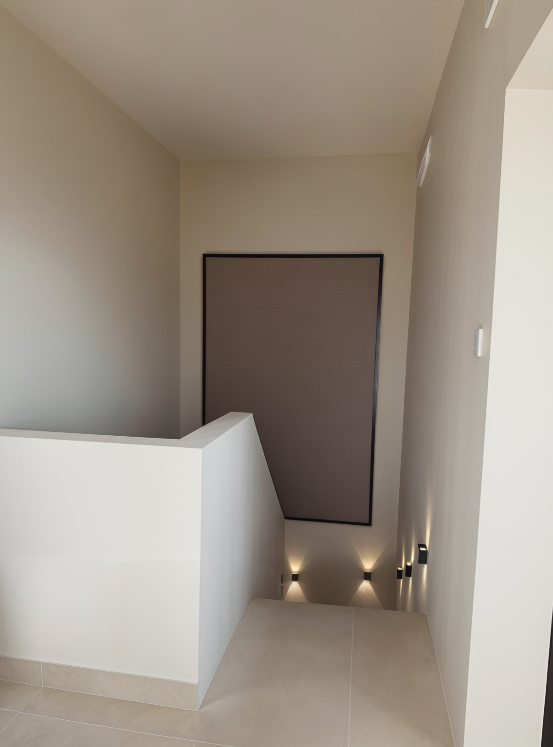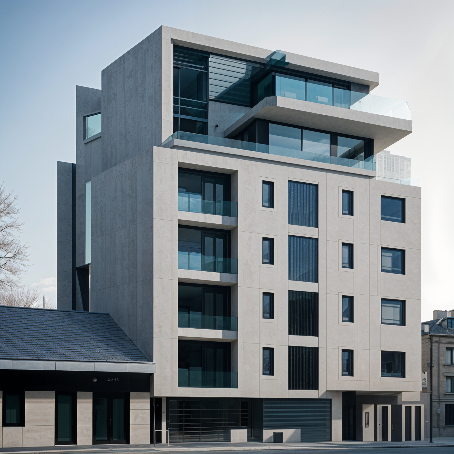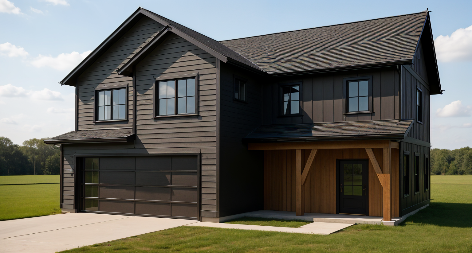 render a beautiful architectural illustration of a two story house the house features a gable roof with deep brown shingles a top section of white siding with decorative white trim creating geometric patterns the lower section is a light olive green siding that adds a touch of earthiness the foundation is made of textured stone in gray tones providing a sturdy appearance large windows with prominent black frames and clear glass reflect a serene bright blue sky the front doors are elegant painted in a rich black with white accents capture a warm and inviting atmosphere with soft sunlight enhancing the colors and textures