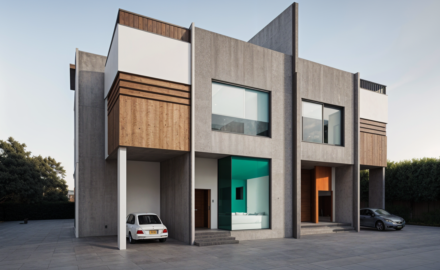brutalism exterior shot use 2 contrasting colors like white and brown architecture