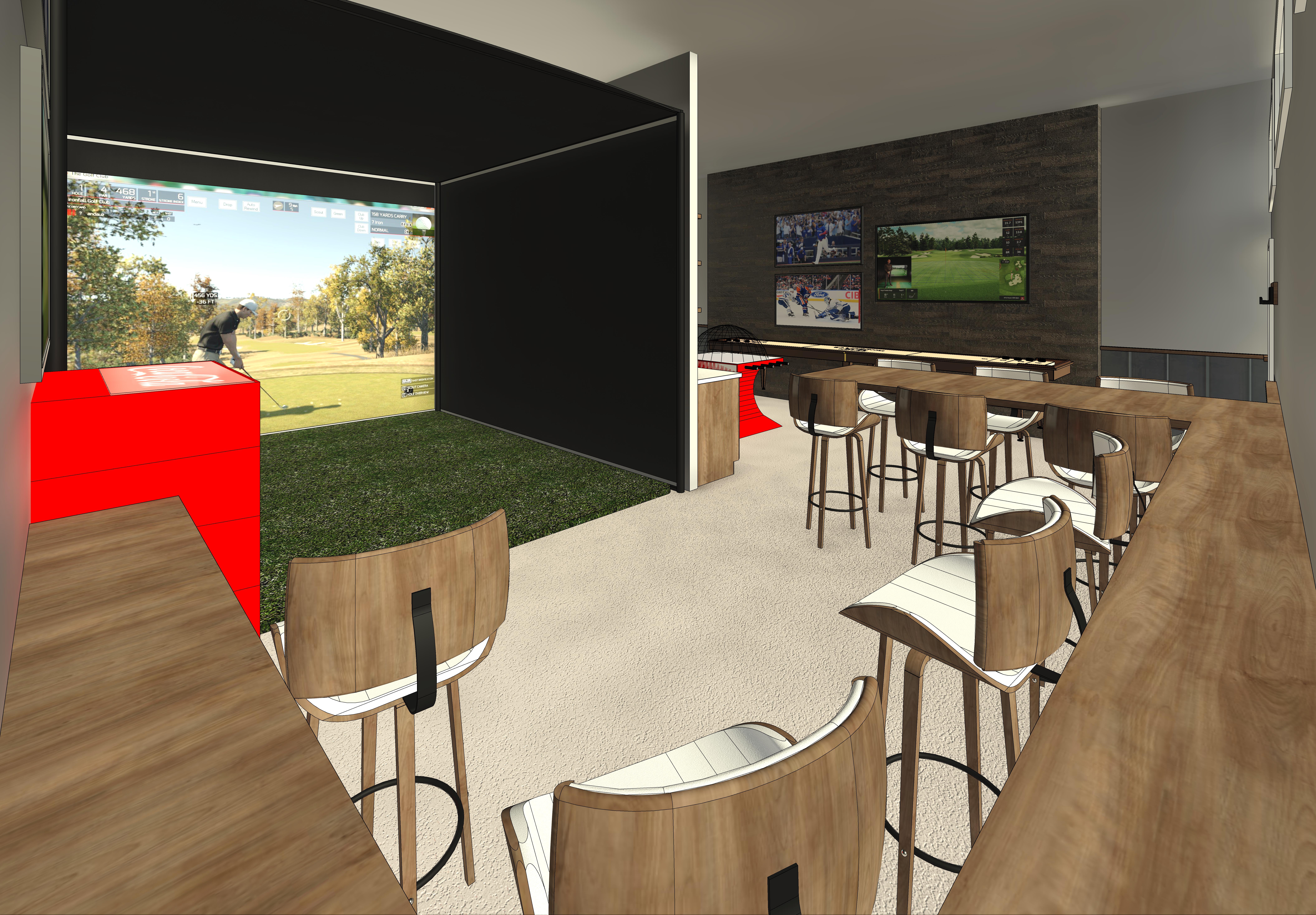 a modern rustic man cave games room the room contains a golf simulator with a hyper realistic putting green floor and black fabric walls and roof with the back having a high definition projector image of the game display shuffleboard below the tv s nhl super chexx pro bubble hockey edmonton oilers model with a black base and a oilers logo visible on the base the red fridge is a coca cola fridge add a vertical coca cola logo to the side of the fridge that is partially visible 3 tv s on the feature tv wall the top tv is displaying a high definition blue jays baseball game the bottom tv is displaying a high definition edmonton oilers hockey game the large tv to the right is showing a high definition golf simulator game matching the projector image in the golf simulator all tv s are softly backlit around their perimeter the entire tv wall with 3 tv s is finished with horizontal medium large planks of rustic reclaimed wood do not backlight the rustic tv wall the bottom 42 of the exterior walls is finished in galvanized vertical corrugated metal capped at the top with a small wood sill that has soft strip led underlighting to accent the corrugated metal soft natural light coming through the windows and pot lights throughout providing gentle ambient soft mood lighting make all the wood for table chairs and corrugated steel trim a medium dark wood grained birch the floor should be a medium dark gray cut and polished concrete floor change nothing else add nothing else
