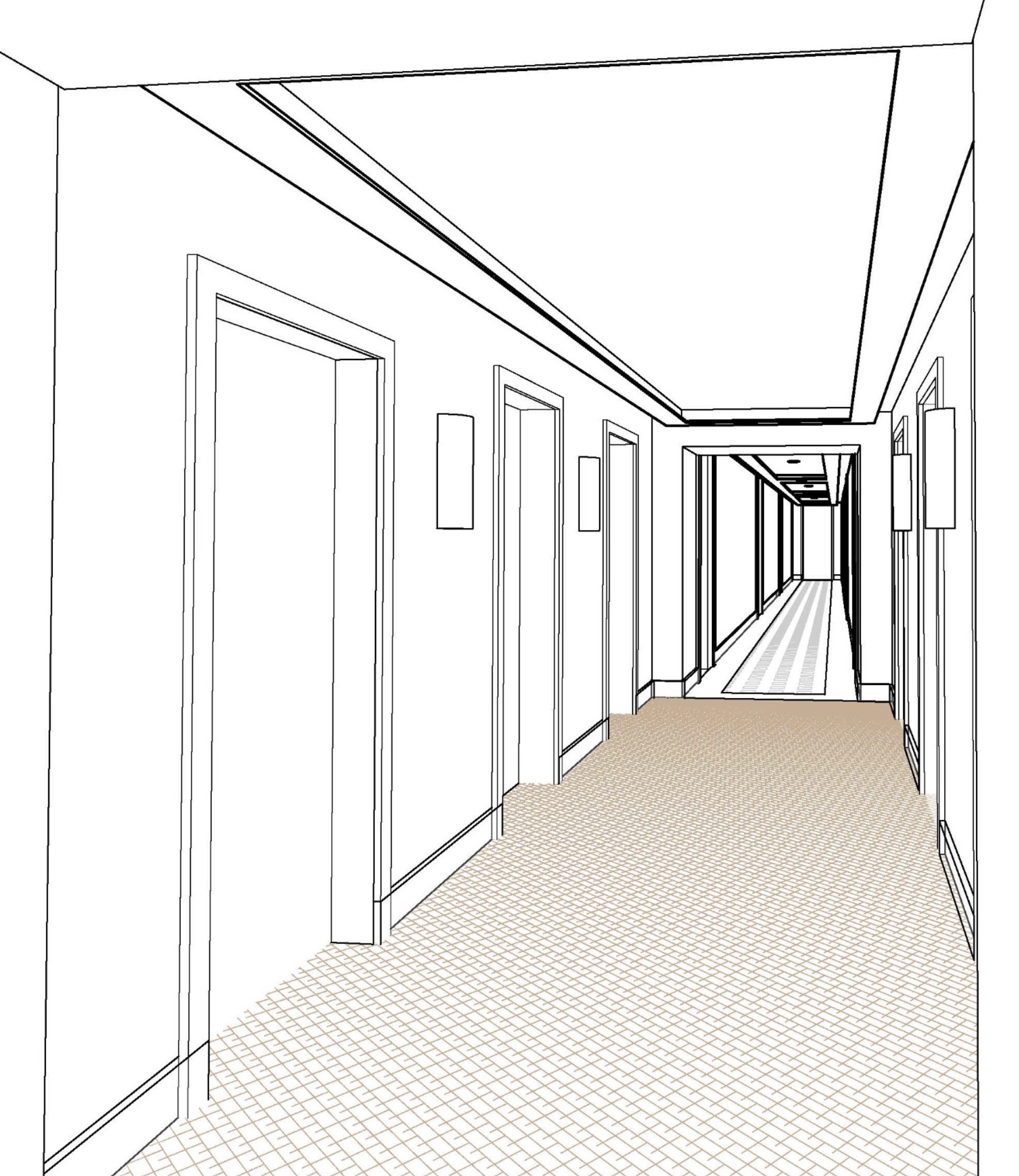 upscale modern condominium elevator lobby and corridor tiles in front of the elevator and carpet tiles in the apartment corridor cove lighted ceiling