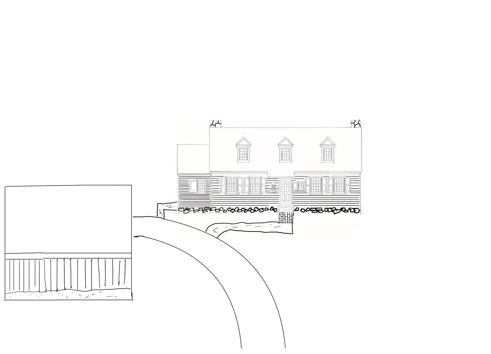 draw me the house as shown in the reference photo the new photo adds an outbuilding detached garage that is not attached to the house it is closer to the viewer and off to the side of the house about 30 away from the house note the driveway coming in between the house and the outbuilding also the brick walks there is no garage door on the outbuilding that faces the viewer the garage door faces the back and is unseen cedar roof and historically accurate outbuilding for chester county pa