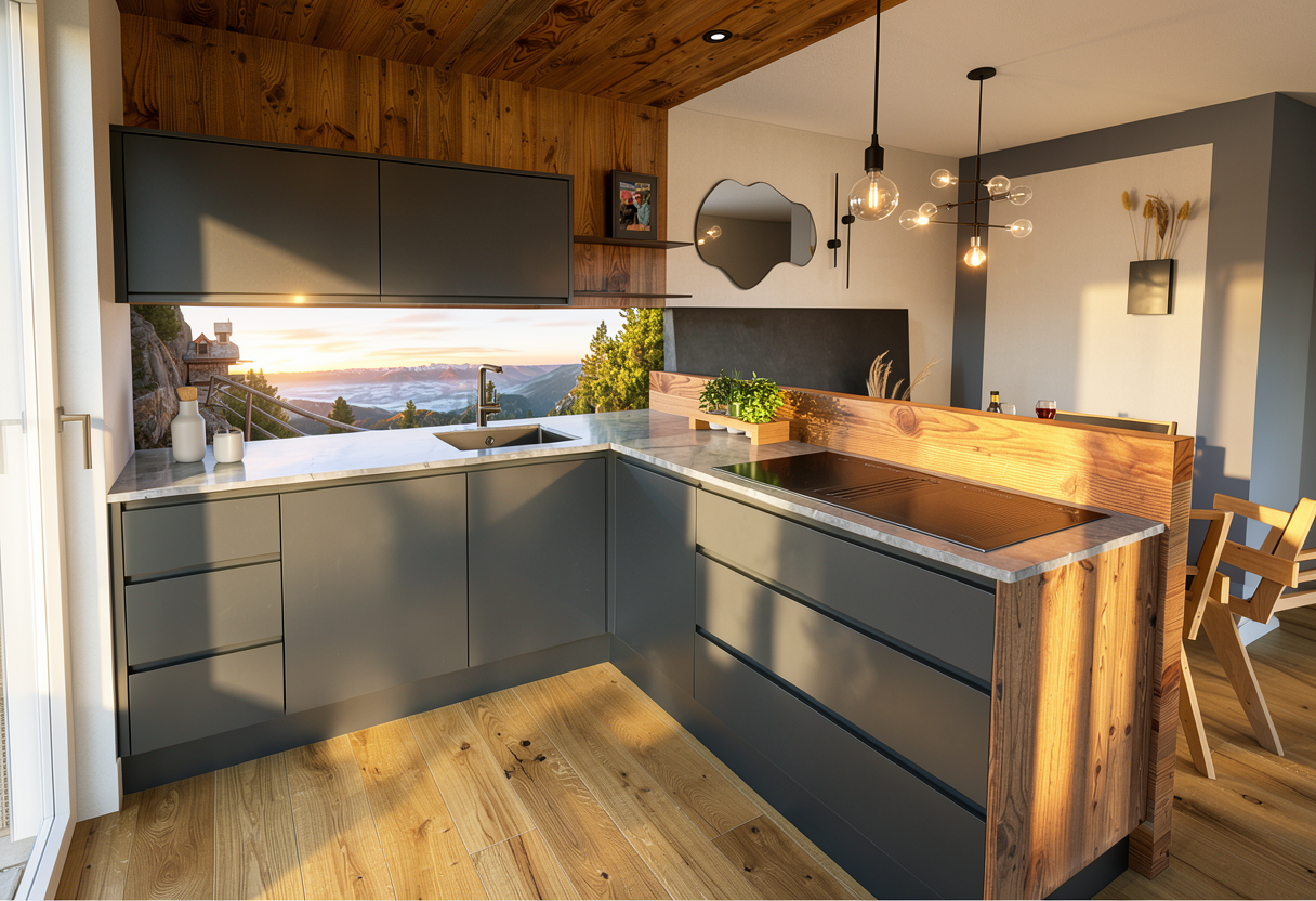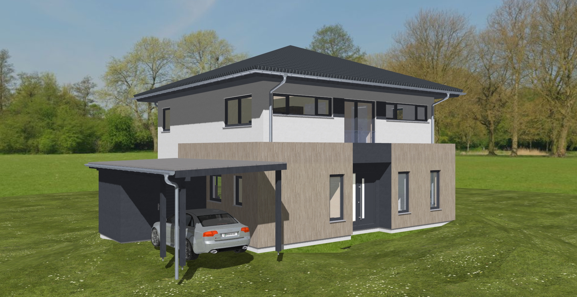 render a modern two storey house with an elegant grey roof and contrasting anthracite grey and immaculate white walls add a warm wood look to the lower part of the exterior fa ade position the house in a park like setting surrounded by tall green trees under a bright blue sky with scattered white clouds add a carport with a metallic grey audi a4 parked underneath a paved path leads to the carport another paved path leads from the carport to the entrance capture a welcoming and tranquil atmosphere and emphasise the harmonious connection between contemporary architecture and nature