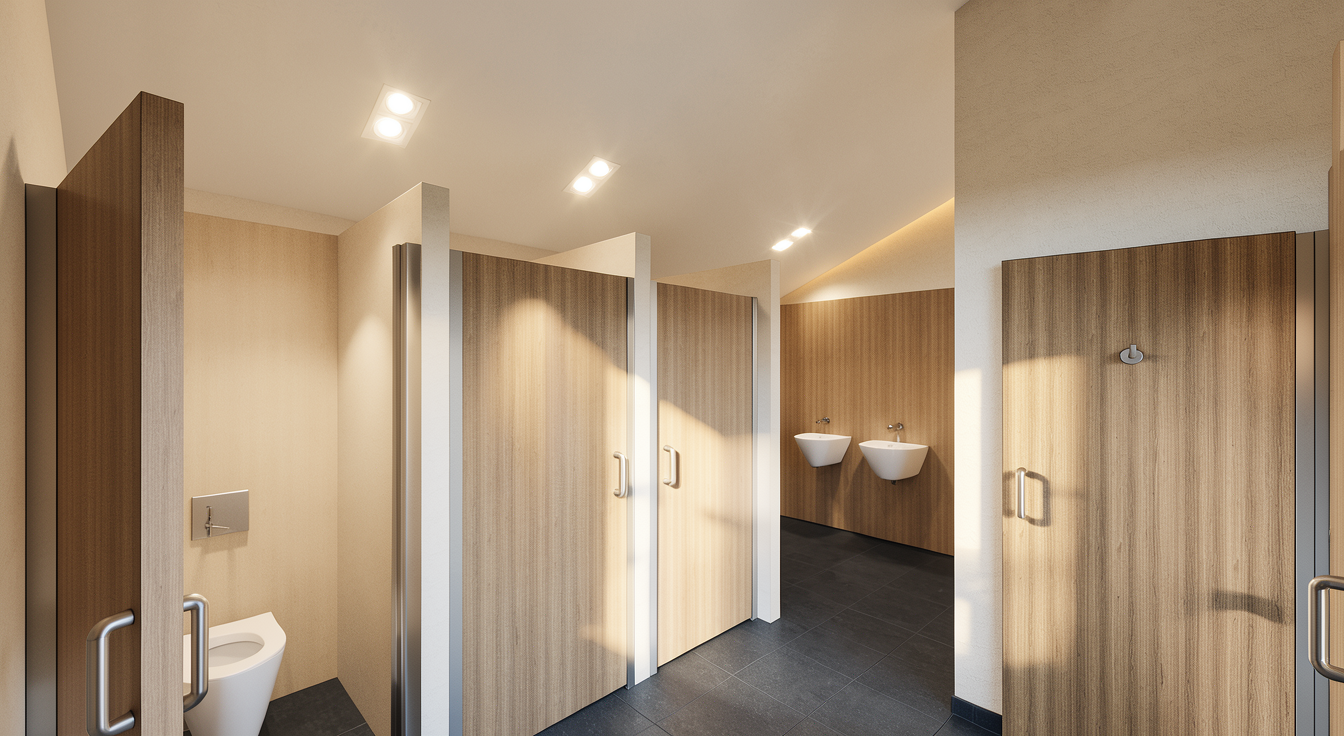 render a modern public restroom with warm natural lighting use soft light brown wood for the walls and doors and choose dark grey concrete for the floors accentuate with stainless steel handles and fixtures incorporate stainless steel sinks and toilets highlight the scene with overhead recessed lighting casting gentle ambient shadows the atmosphere should feel clean inviting and contemporary