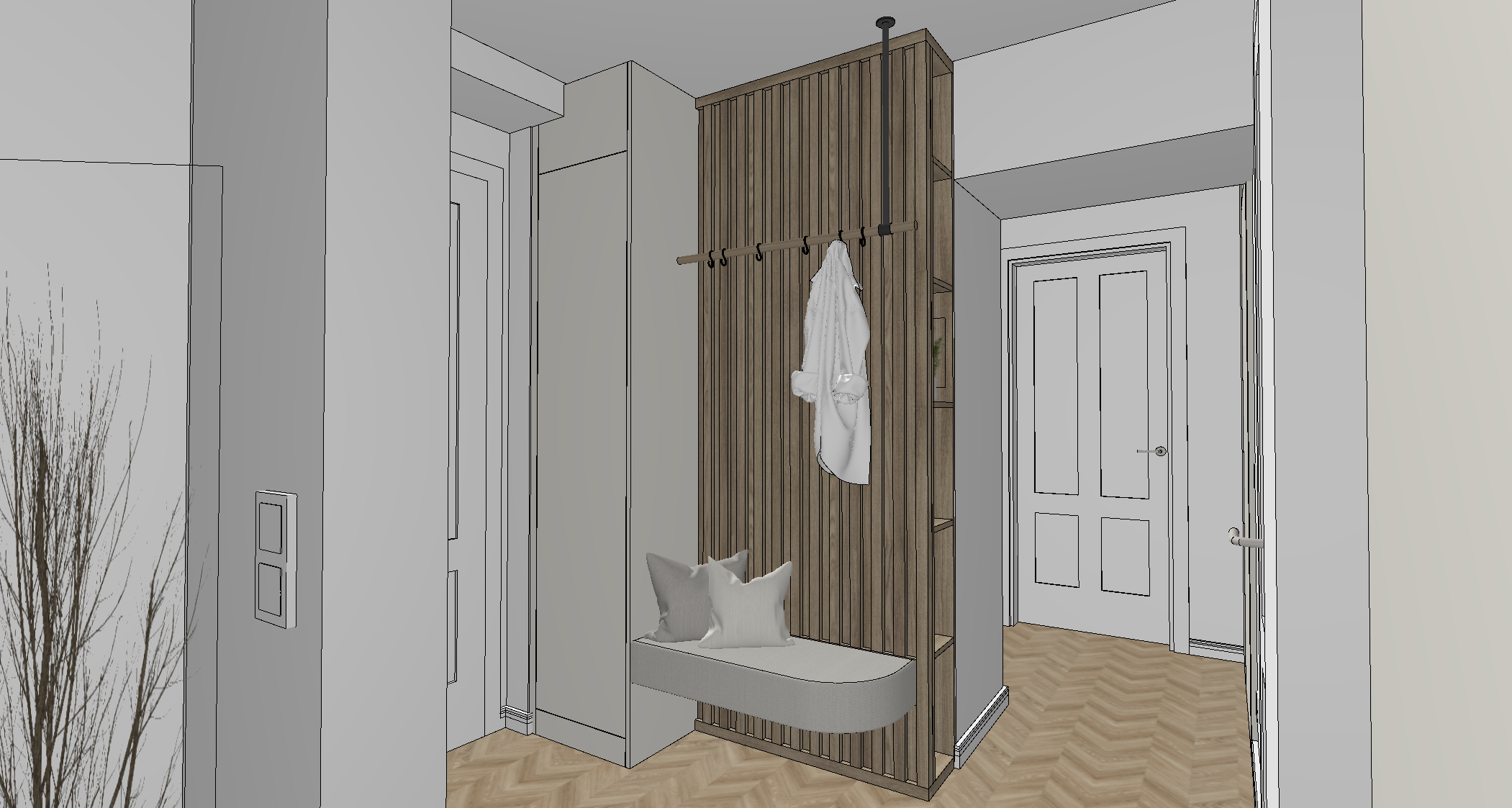 altbauwohnung in salzburg warme lichtstimmung holzberfl chen in eiche w nde und innent ren in wei sitzbank in beigen boucle ein paar damenschuhe unter der sitzbank