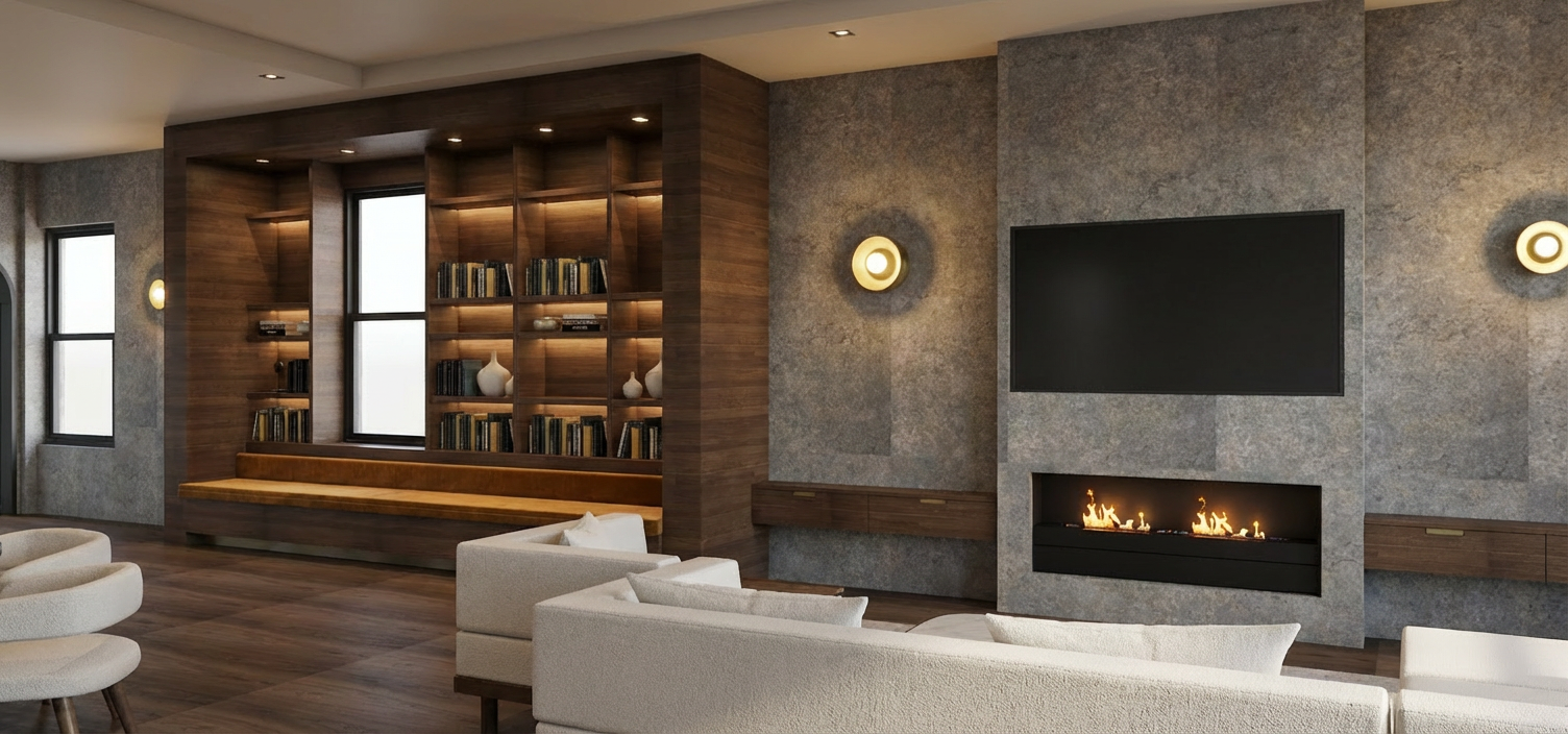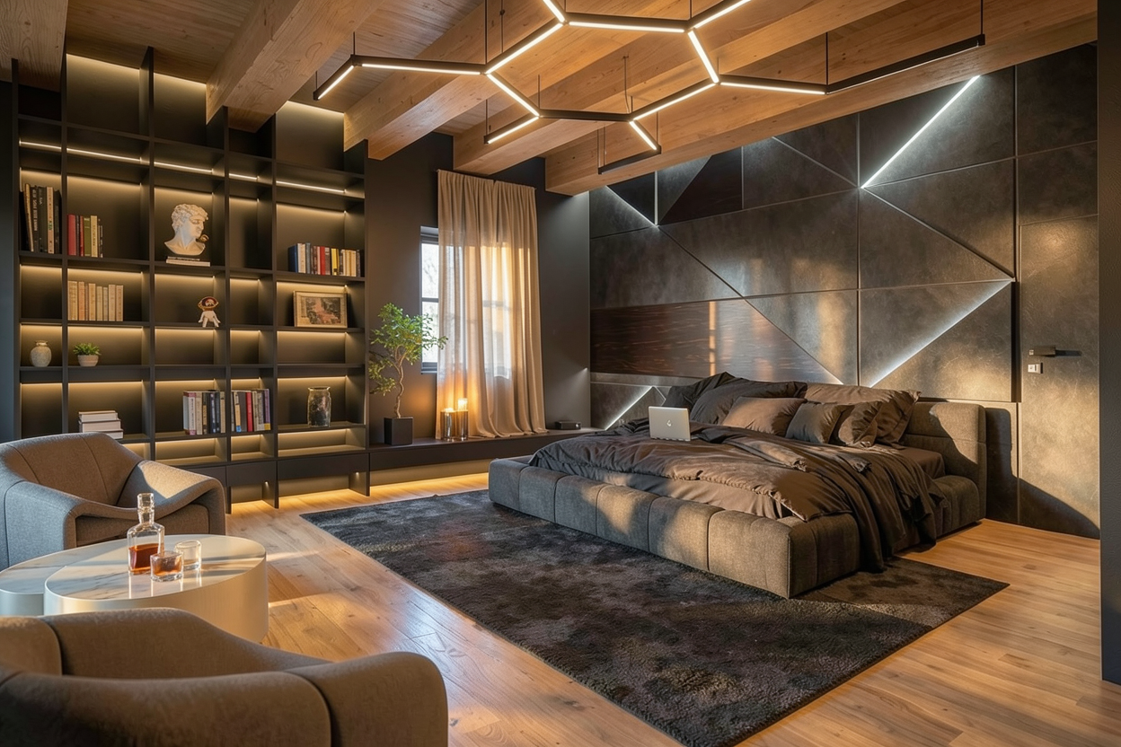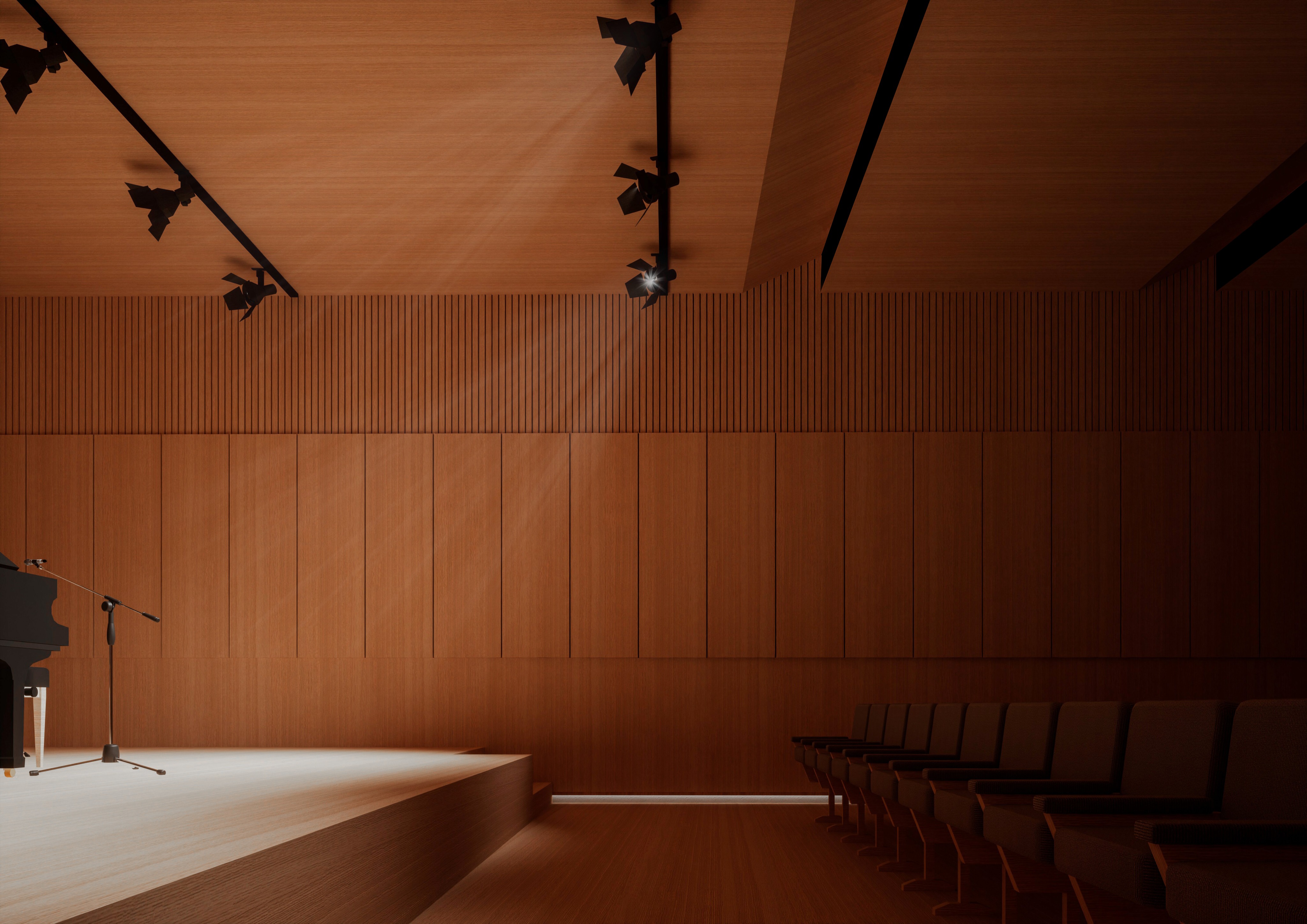 a wide angle hyper realistic photograph captures a modern chamber music hall interior the room features warm cherry wood acoustics with smooth vertical planking on the ceiling and textured wood slat paneling on the upper wall section on the left a grand piano with its lid propped open sits on a raised stage next to the piano is a vintage style microphone mounted on a simple chrome stand a precise sharp spotlight beam from a modern track light creates dramatic chiaroscuro lighting on the piano keys and floor on the right side of the frame four rows of empty theater seats with brown upholstered backs are lined up on the lower level cast in soft shadow the composition uses leading lines from the stage steps and the seats to draw the eye minimalist modern architectural details cinematic lighting photorealistic textures 8k