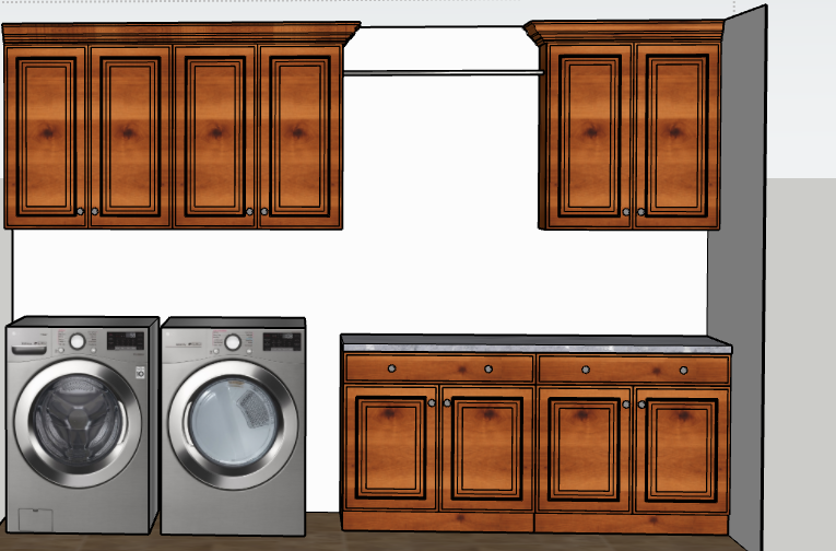 this is a laundry room with cabinets made of natural stained alder with a toffee glaze the floors are an off white tile the cabinets go to the ceiling with 2 step crown molding