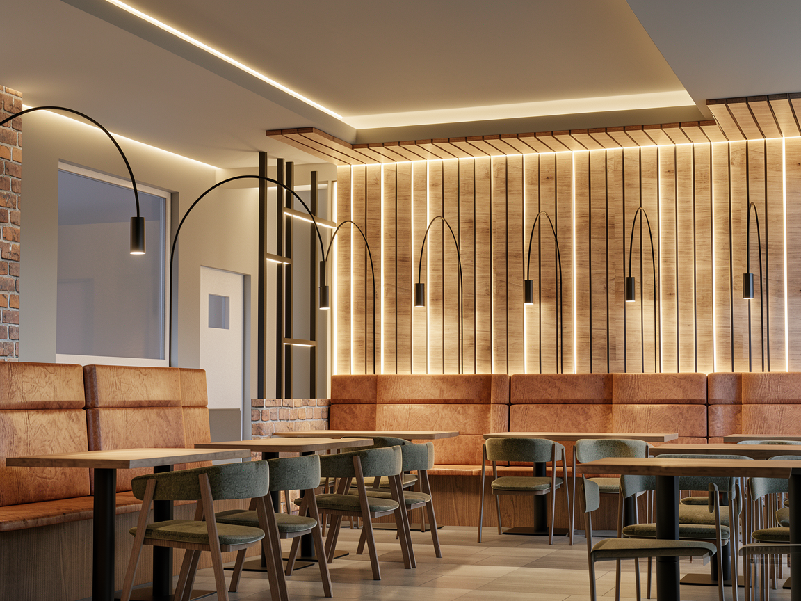 refine the previously generated image while strictly preserving the exact camera perspective layout furniture placement and architecture important correction bring back the hanging wine glass installation in the central ceiling area the wine glasses must be clearly visible again and remain an important design feature above the tables wine glass installation reintroduce a dense but elegant arrangement of hanging clear wine glasses in the central ceiling zone the wine glasses must be realistic in size with a maximum height of 30 cm they should hang slightly further forward more above the tables and closer to the viewer keep them visually present but organized and refined vary the hanging heights slightly to create depth use nearly invisible suspension lines the glasses must not emit light and must not contain bulbs lighting for the glasses the wine glasses should only reflect and refract surrounding light naturally add very subtle realistic highlights on the rims and edges of the glasses integrate soft warm micro led string lights or concealed linear lighting into the black ceiling grid structure but keep the lighting discreet and physically believable no random floating sparkles no excessive glitter effect no decorative fairy light look back wall clearly keep and emphasize the warm vertical led light strips between the walnut wood slats the wall lighting should create depth and warm gradients on the walnut surface the walnut wood must look natural rich and realistic materials matte black ceiling black floor tiles with subtle matte texture warm brown leather seating with natural texture and low gloss realistic walnut wood slats with variation in grain and tone atmosphere and realism warm soft indirect restaurant lighting cozy and elegant not flashy reduce cgi look completely reduce glossiness and over sharpness add slight imperfections realistic reflections natural light falloff soft shadows and a photographic feel the final image should look like a real high end restaurant photo with a clearly visible hanging wine glass installation soft integrated lighting and warm illuminated walnut wall slats wine glas hight max 30cm more whine glas