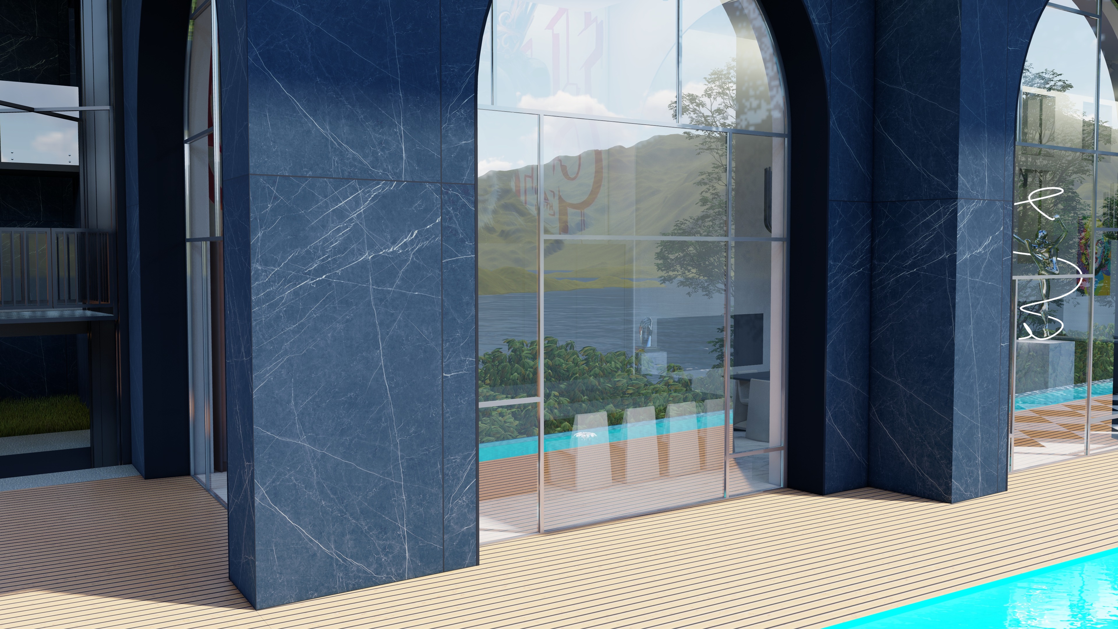 a modern elegant interior space featuring a white spiral staircase with gentle curves and a polished finish the staircase is paired with a floor of glossy dark marble tiles reflecting the ambient light warm soft sunlight filters through large windows casting intriguing shadows and highlights on the light beige walls in the foreground positioned comfortably is a set of plush chocolate brown armchairs adding a touch of coziness a large artistic wall mural features an abstract design in deep green and gold hues enhancing the sophisticated atmosphere the overall ambiance is one of refined luxury and contemporary elegance