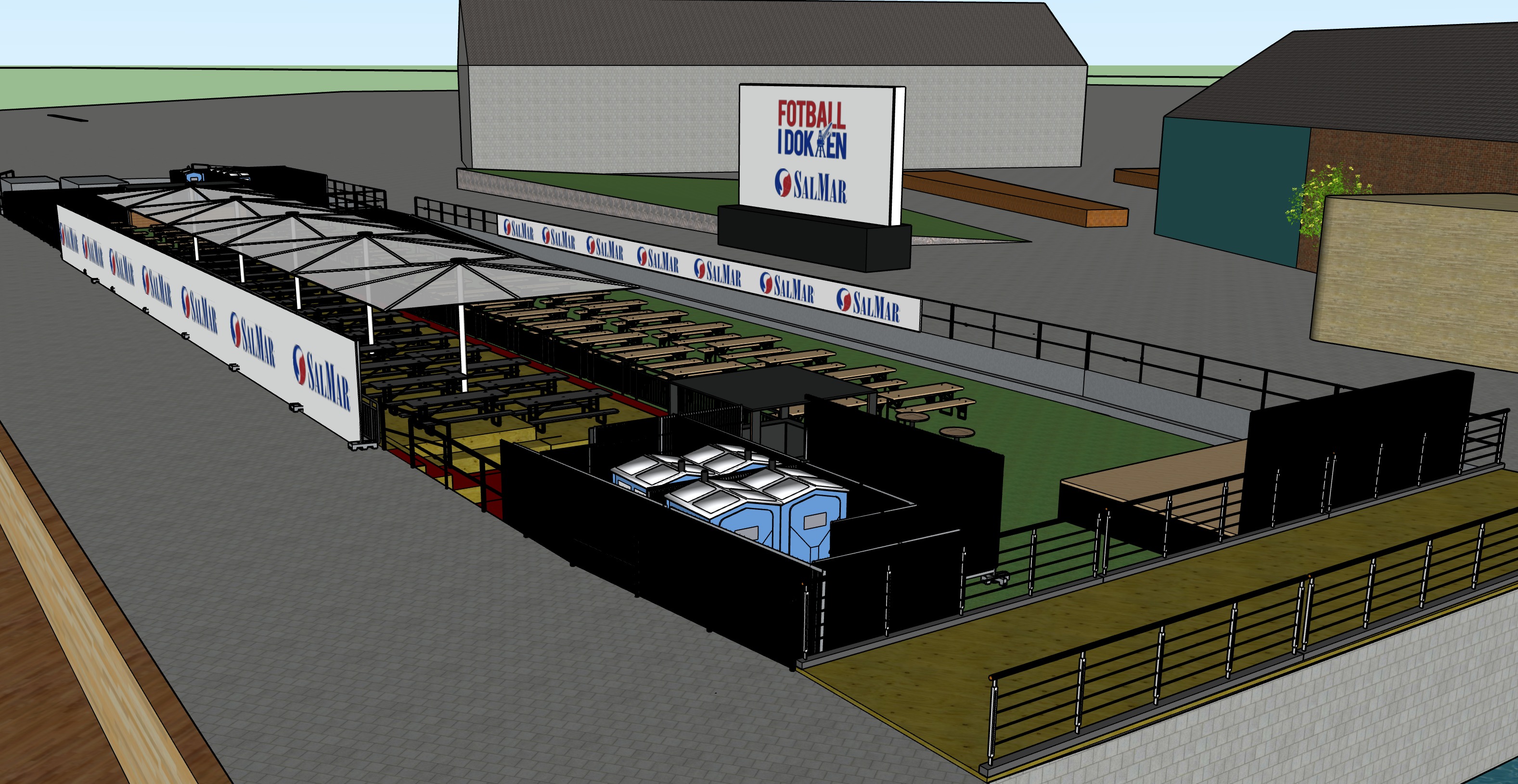 photorealistic event visualization of the vip entrance for fotball i dokken at golden hour prompt ultra realistic architectural event visualization of the vip entrance area for fotball i dokken no people in the scene no humans no silhouettes no shadows of people no reflections of people absolute priority keep all logos exactly as in the original image do not alter redraw retype reinterpret or stylize any logo salmar logos and fotball i dokken logos must remain 1 1 identical in color size spacing typography and placement backgrund is a city no grass on the bridge down right n floor materials very important red area is a vip event carpet clean premium realistic fabric texture green area is artificial turf fake grass uniform and perfect no weeds no dirt right side is a brick stone pedestrian walkway dry surface no water lighting realism golden hour early evening light warm and soft subtle ground spotlights aimed toward the vip wall to emphasize sponsor logos natural shadows realistic reflections clean professional look no geometry changes do not change any dimensions proportions railings fences bar structure screen containers or placements enhance only materials lighting realism and atmosphere high realism correct perspective sponsor ready visualization negative prompt anbefalt people silhouettes crowds reflections of people any logo distortion misspelling recoloring or resizing wrong scale giant wall look distorted perspective water puddles or reflections on the right side added objects changed geometry resized elements people must look normal adult height approx 1 70 1 90 m so the 2 m wall appears realistic the wall should be slightly above head height not towering over people absolute priority keep all logos exactly as in the original image no changes to salmar logo or fotball i dokken logo no retyping no stylizing no color shifts no resizing no repositioning keep the logo wall 1 1 identical to the reference people placement vip guests stand along the vip wall posing for photos several people taking pictures in front of the wall pedestrians who are passing by must walk on the brick stone pedestrian street to the right not across the vip turf carpet bar area to the left is active bartenders serving drinks guests standing at the bar premium vip vibe floor materials red area is vip carpet with realistic event carpet texture and clean edges green area is artificial turf fake grass clean and perfect uniform no weeds right side is brick stone pavers walkway no water no geometry changes keep the sketchup layout exactly as is do not move resize or add structures only improve realism lighting materials people shadows atmosphere high realism correct perspective correct scale sponsor ready look negative prompt legg inn om du kan wrong human scale tiny people giant wall look distorted perspective any changes to logos or text people walking on turf carpet as main path water on right side any geometry changes