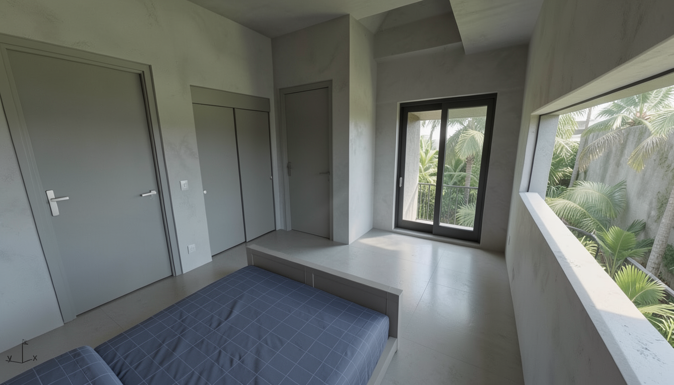 imagine ultra realistic architectural interior rendering of a two story accessory dwelling unit adu second floor bedroom interior minimalist tropical modern architecture compact sleeping space with thick plaster or concrete walls recessed second floor balcony accessed through dark framed sliding glass doors horizontal slot window on adjacent wall providing filtered daylight deep window reveals inward facing and private spatial character low ceiling height creating compression simple flush interior doors and built in closet doors smooth concrete or plaster finishes with subtle imperfections muted neutral color palette soft indirect daylight only calm and quiet atmosphere no decorative furniture emphasis strong shadow depth professional architectural visualization eye level interior perspective raw photo realism ar 4 3 style raw