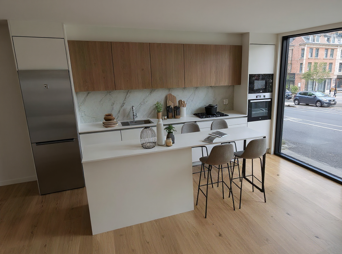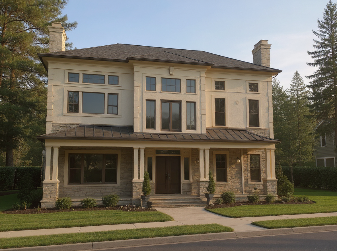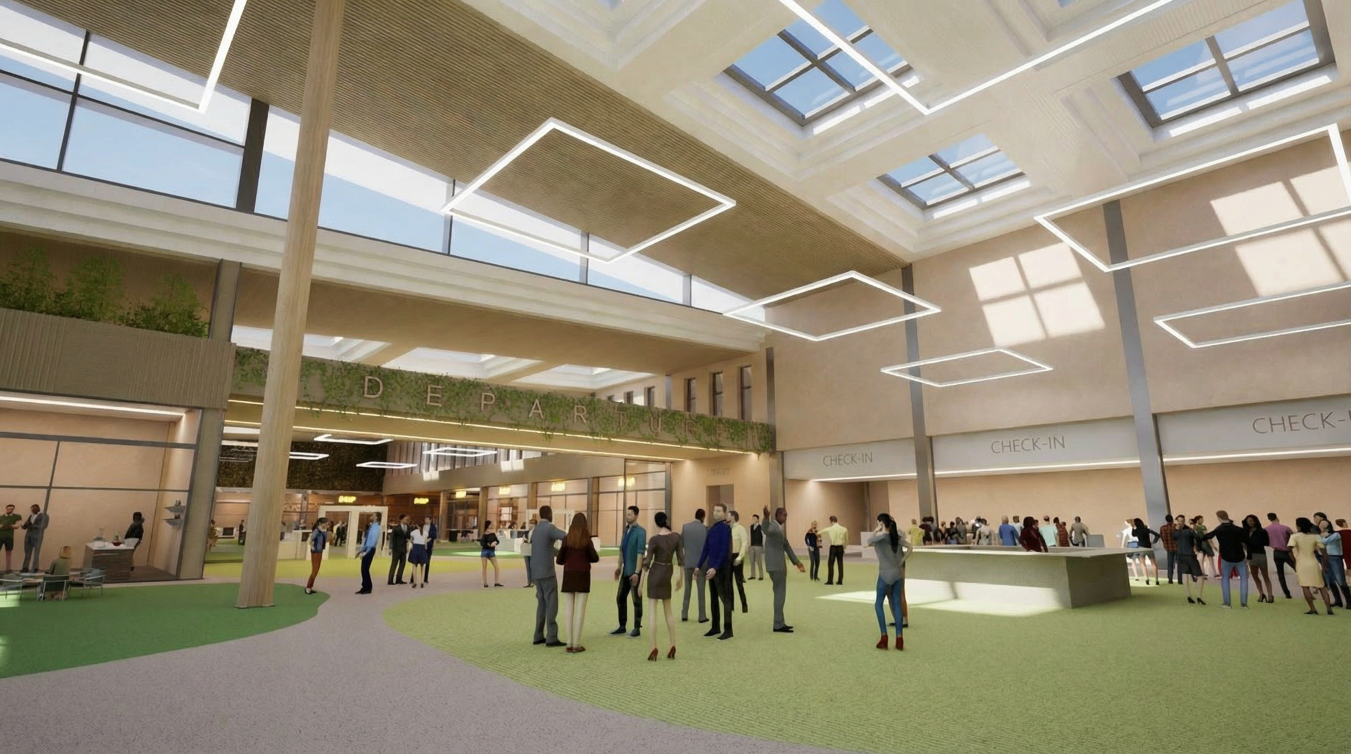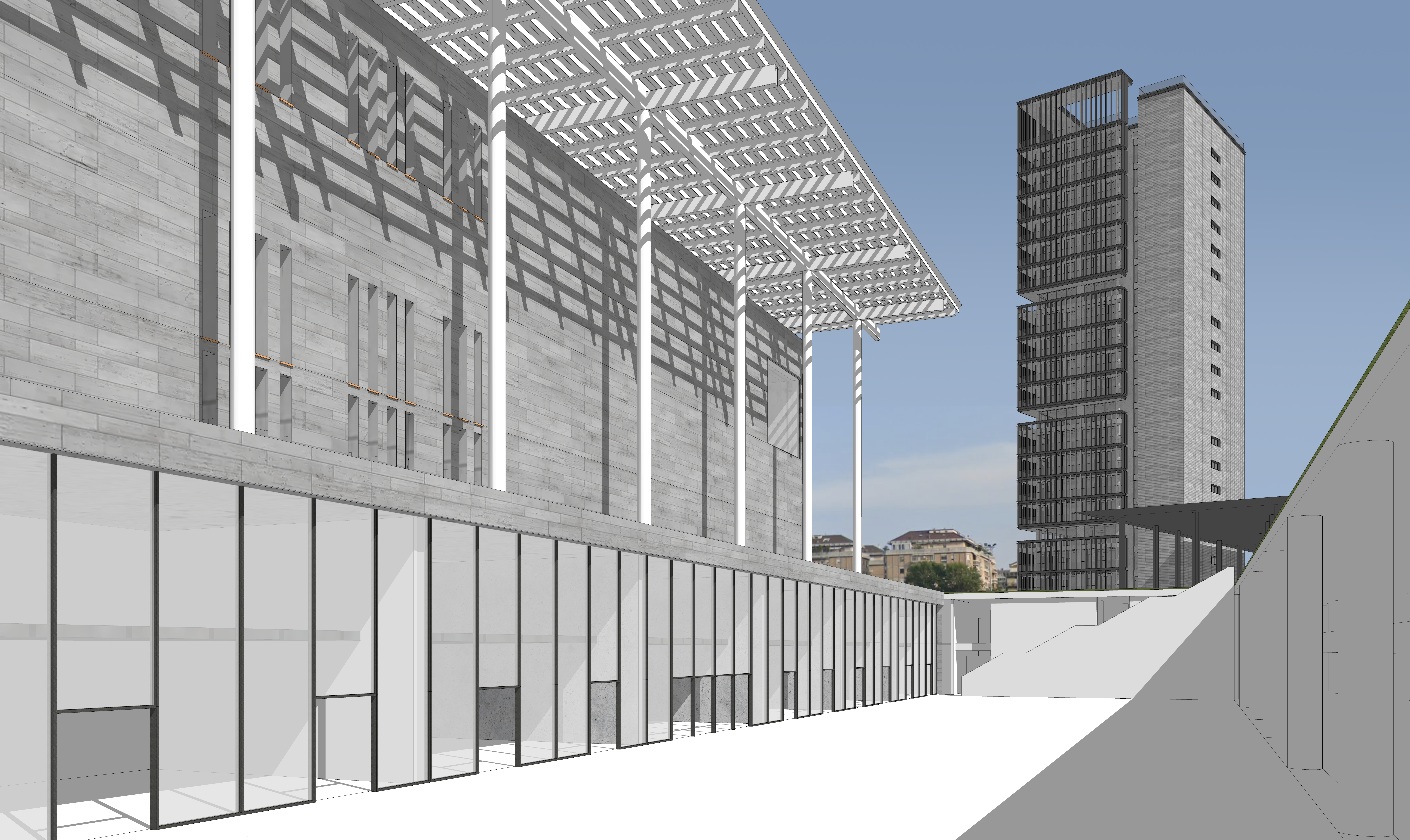 architecture rendering detailed realistic include people its the entrance space to a theater round columns to the right all metal dark grey stone cladding for the upper left facade the rest concrete