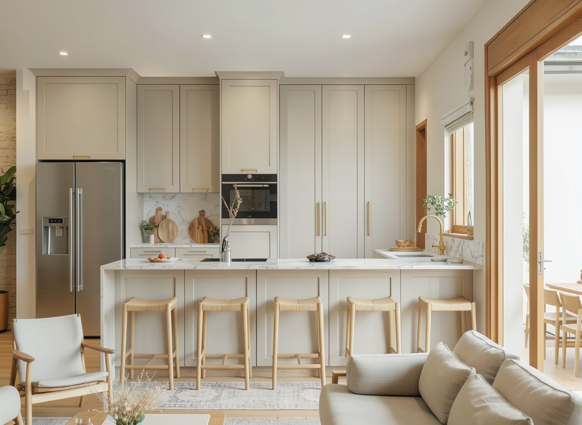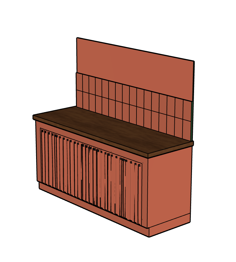vertical rectangular orange glazed tiles with dark wooden work surface and bistro style orange curtain under the work surface no sink and dark wooden floor