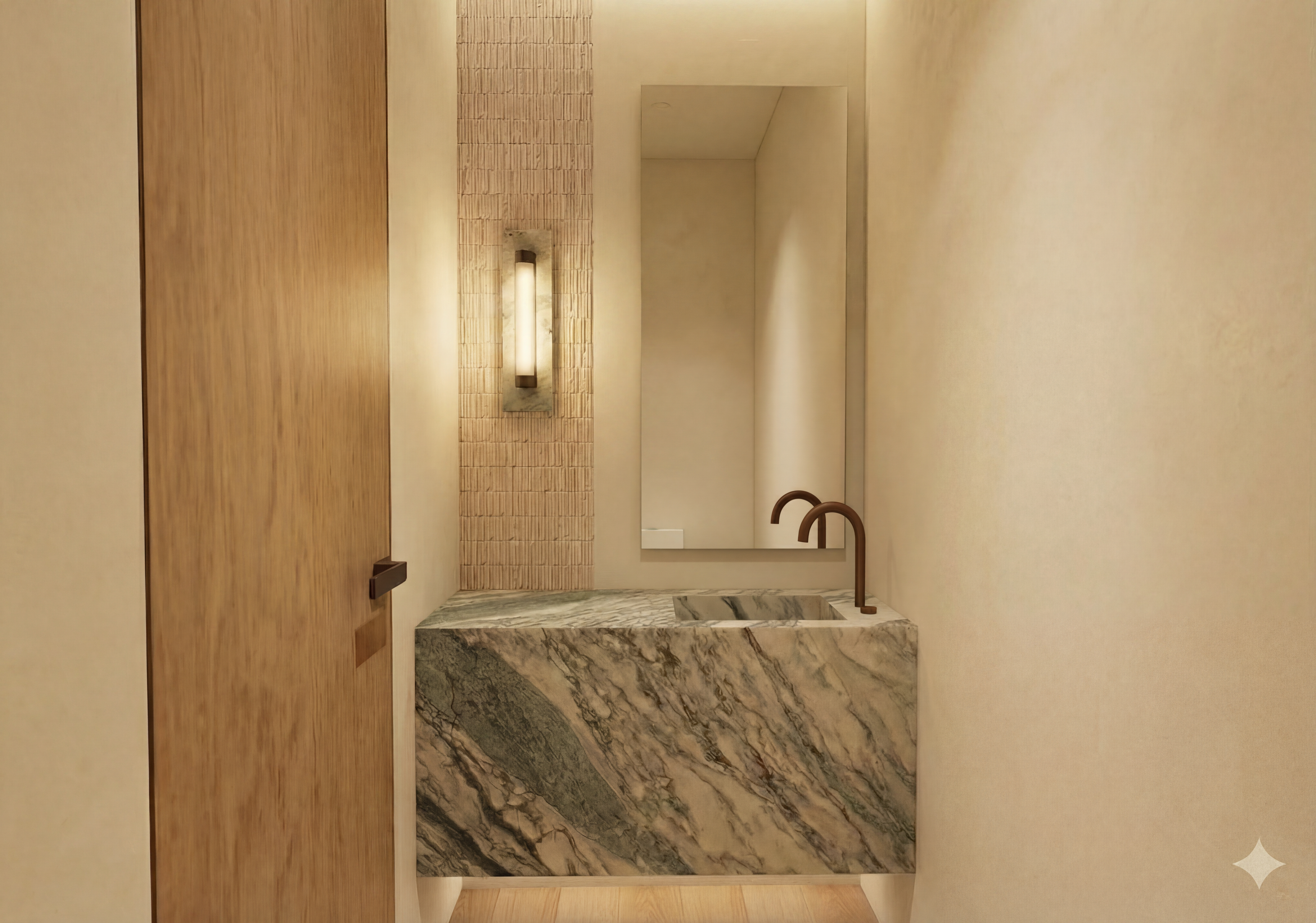 make cabinets slightly lighter and replace the two ceiling recessed lights that are not on with brass thin cylinder spot lights