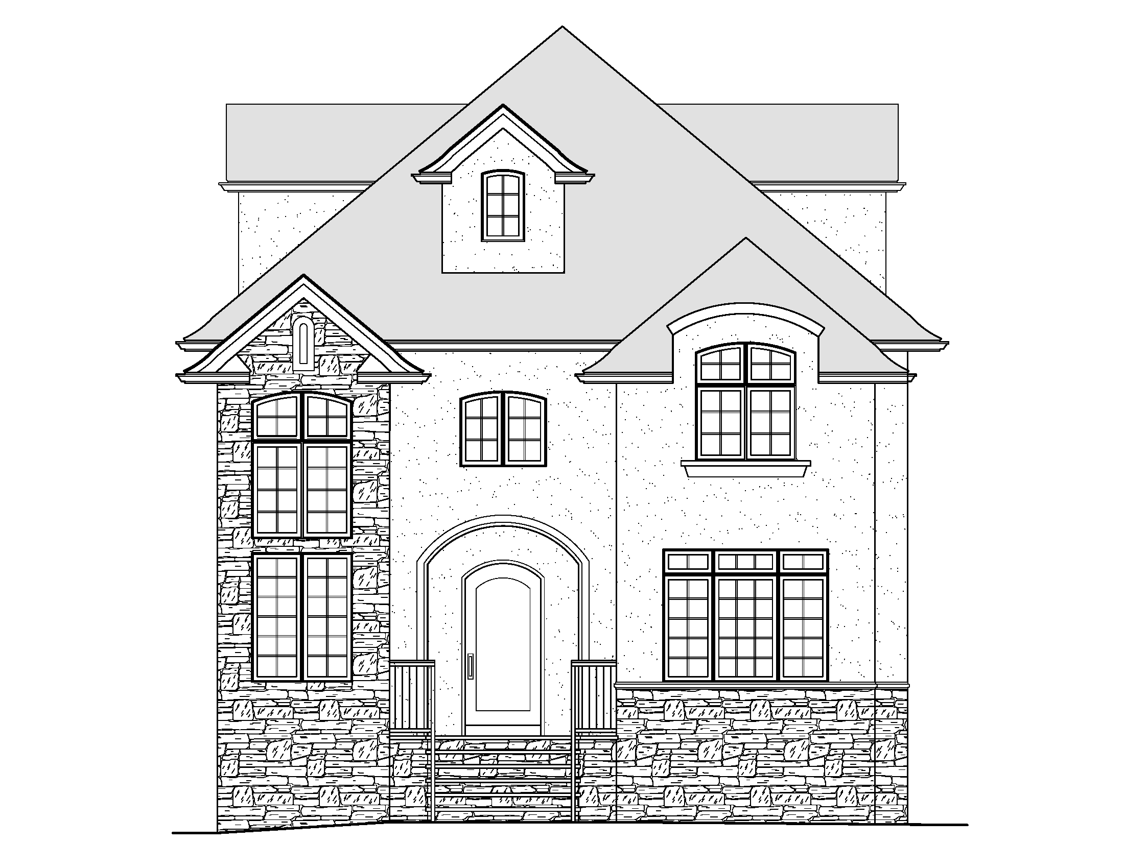 render realistic using white stucco with mixed brown color stone and black windows black accents black doors and black roofs set this is a residential neighborhood with large mature trees and very upscale landscaping provide shrubs and landscaping around the base of the house do not add any other additional structure to the house