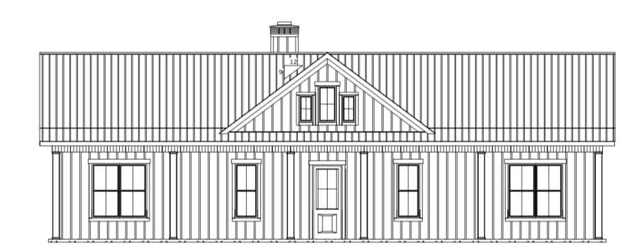 barndominium exterior shot texas style metal building barndominium exterior vertical steel siding dark charcoal metal roof black trim windows large covered front porch with cedar posts stone accent base realistic photography set in open texas pasture with oak trees and big sky architecture