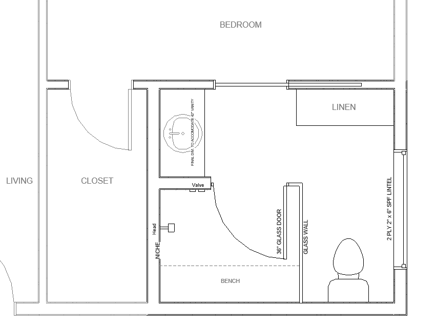 convert this floor plan into a realistic isometric 3d view of a bathroom show the space from an elevated angle with furniture walls and details visible white cream colour scheme for tile walls with cream coloured shiplap glass shower walls oak vanity with mirror and vanity light pot lights evenly spaced within room soft neutral lighting use the same furniture as shows on the plan do not change the orientation of the floorplan